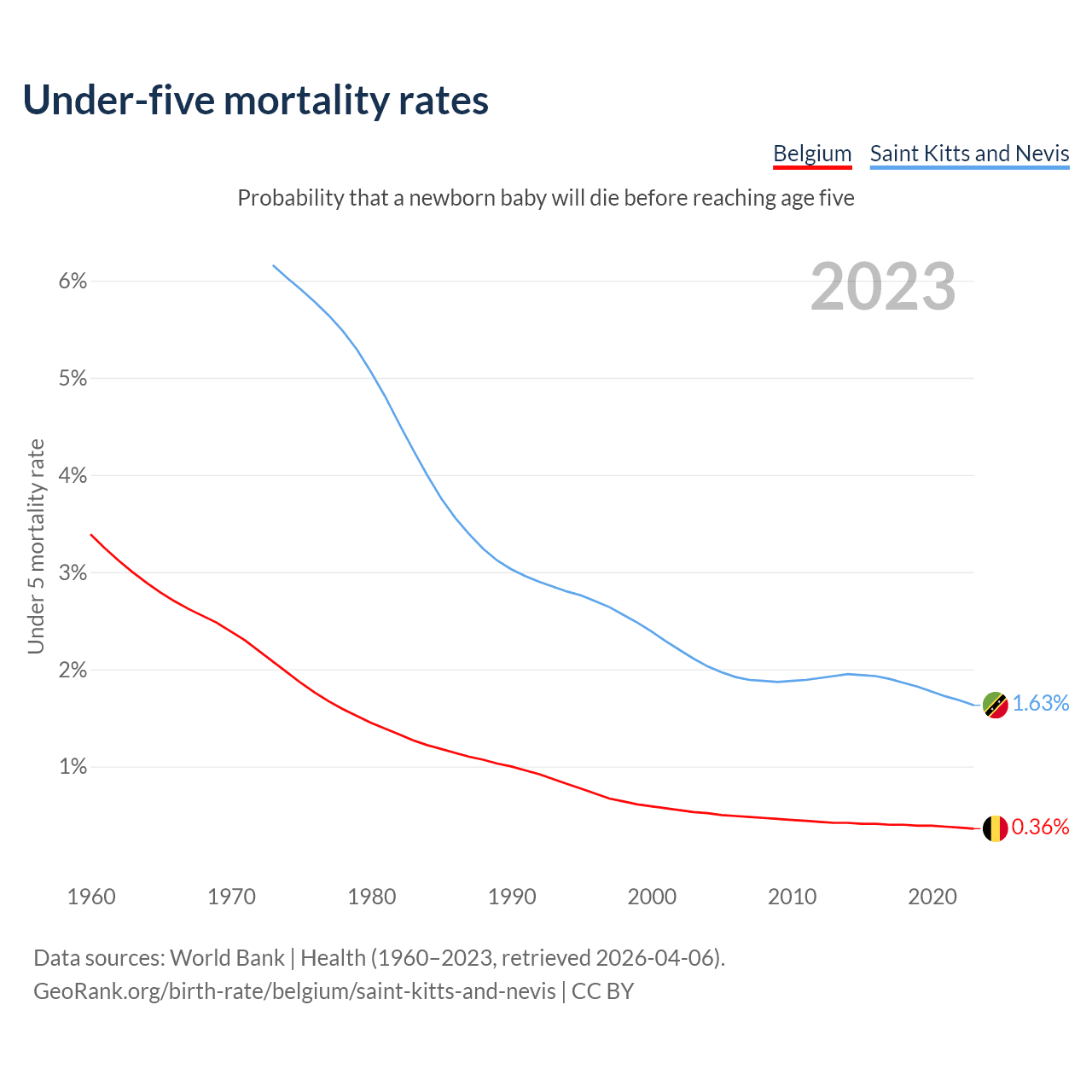 The chance that a newborn baby will die before reaching age five is 0.36% in Belgium and 1.63% in Saint Kitts and Nevis. Above is a chart with historical data on under-five mortality rates.