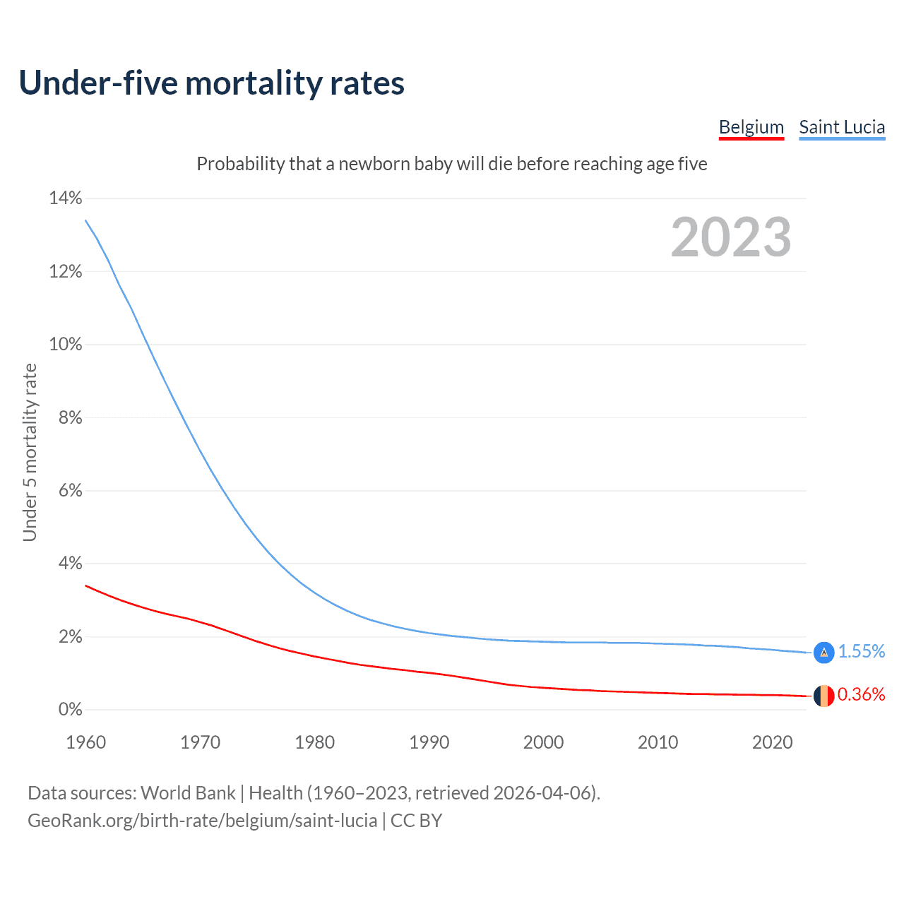 The chance that a newborn baby will die before reaching age five is 0.36% in Belgium and 1.55% in Saint Lucia. Above is a chart with historical data on under-five mortality rates.