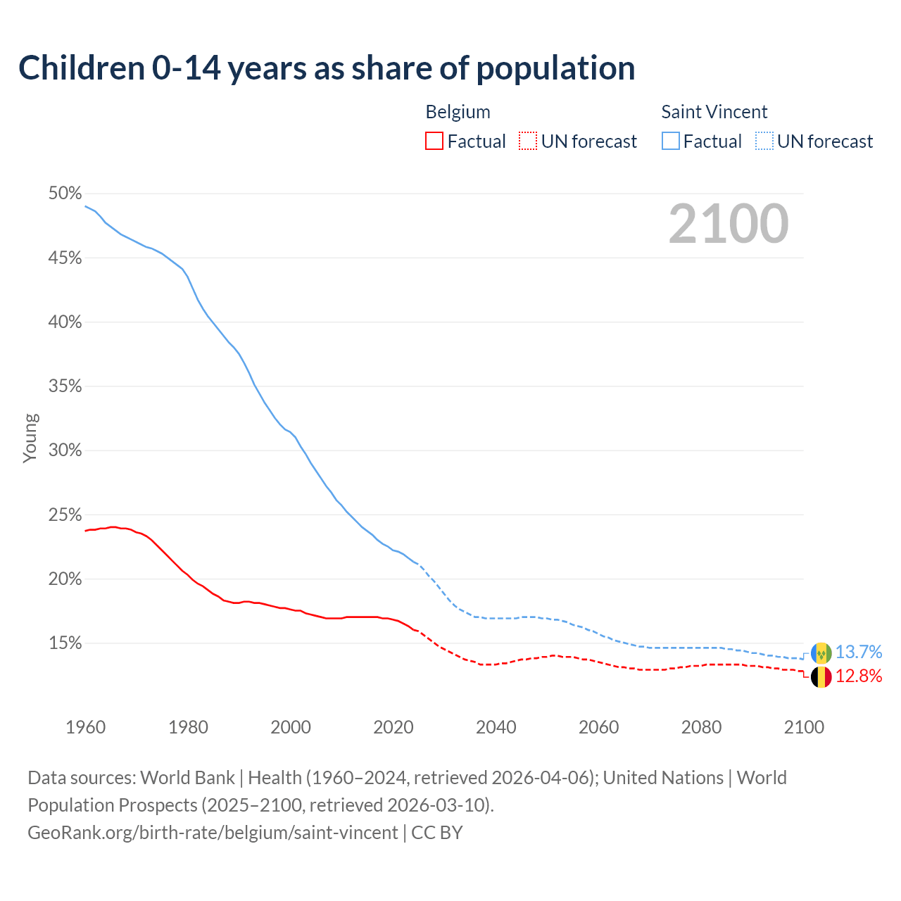 According to the latest available data on birth rates, the fertility rate in Belgium was 1.47 children per woman in 2023, compared to 1.78 in Saint Vincent in 2023. The replacement level is considered to be 2.1 children per woman.