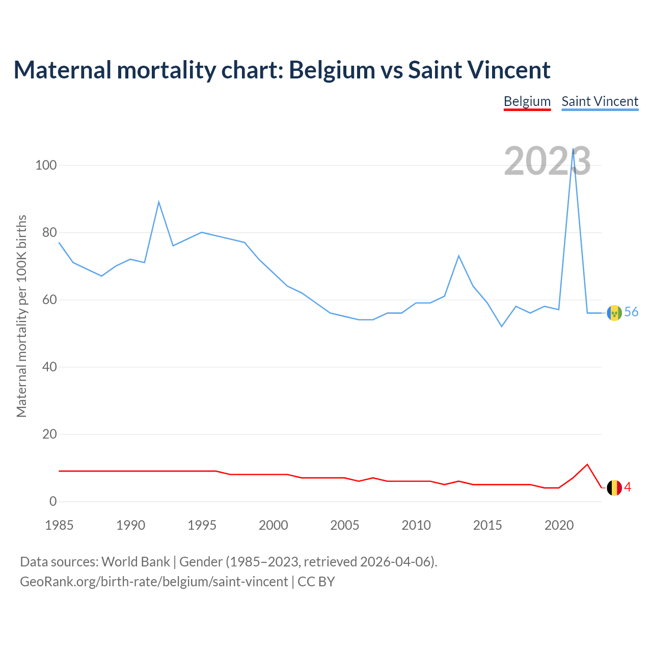 The maternal mortality rate, which is the probability of dying during childbirth or within 42 days of pregnancy termination, is 4 deaths per 100,000 live births in Belgium, compared to 56 deaths in Saint Vincent.
