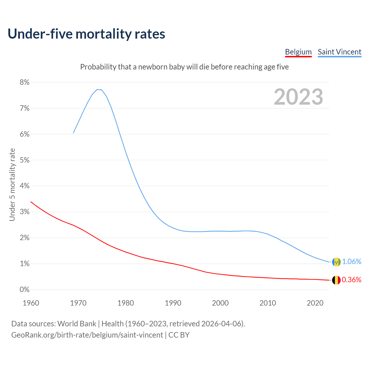 The chance that a newborn baby will die before reaching age five is 0.36% in Belgium and 1.06% in Saint Vincent. Above is a chart with historical data on under-five mortality rates.