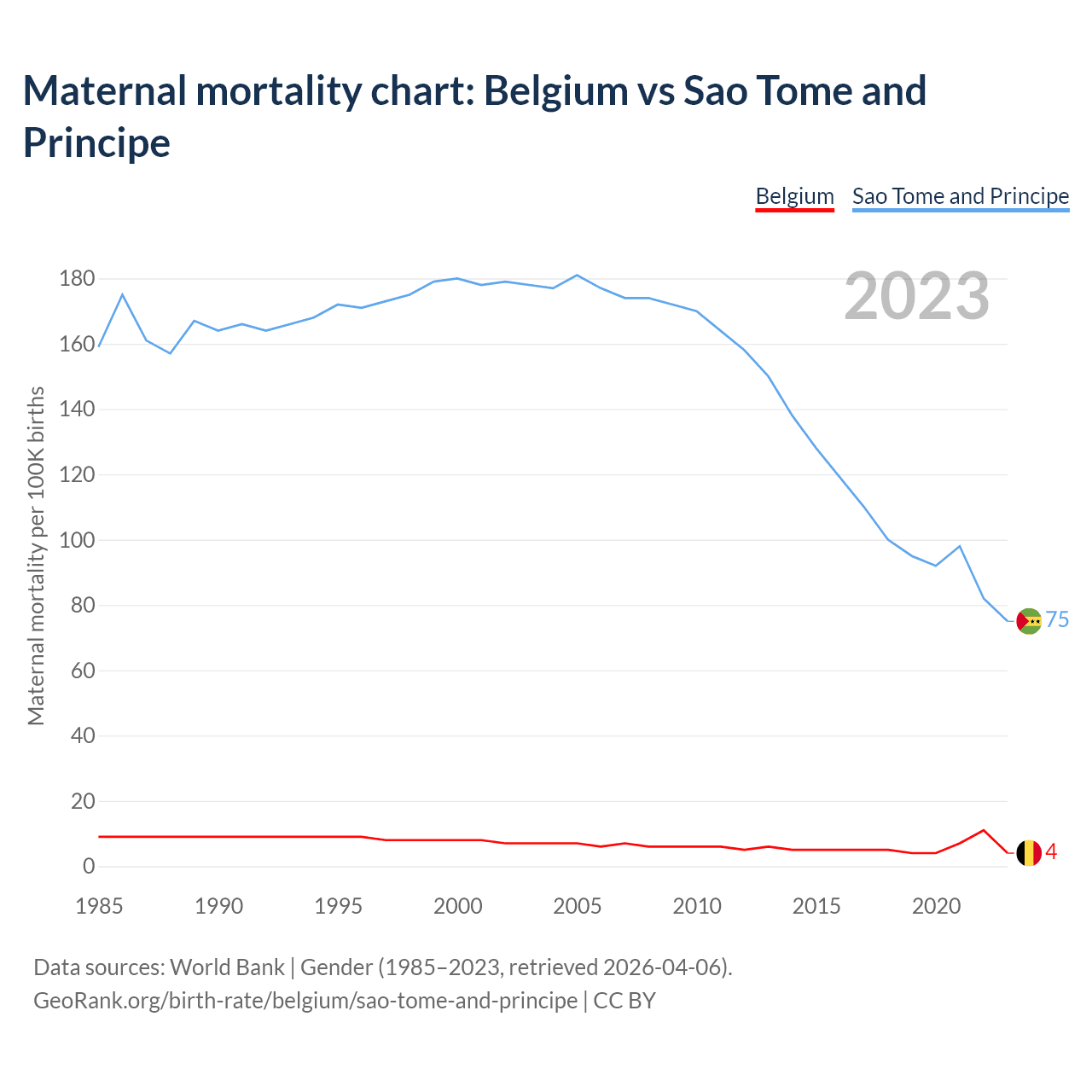 The maternal mortality rate, which is the probability of dying during childbirth or within 42 days of pregnancy termination, is 4 deaths per 100,000 live births in Belgium, compared to 75 deaths in Sao Tome and Principe.