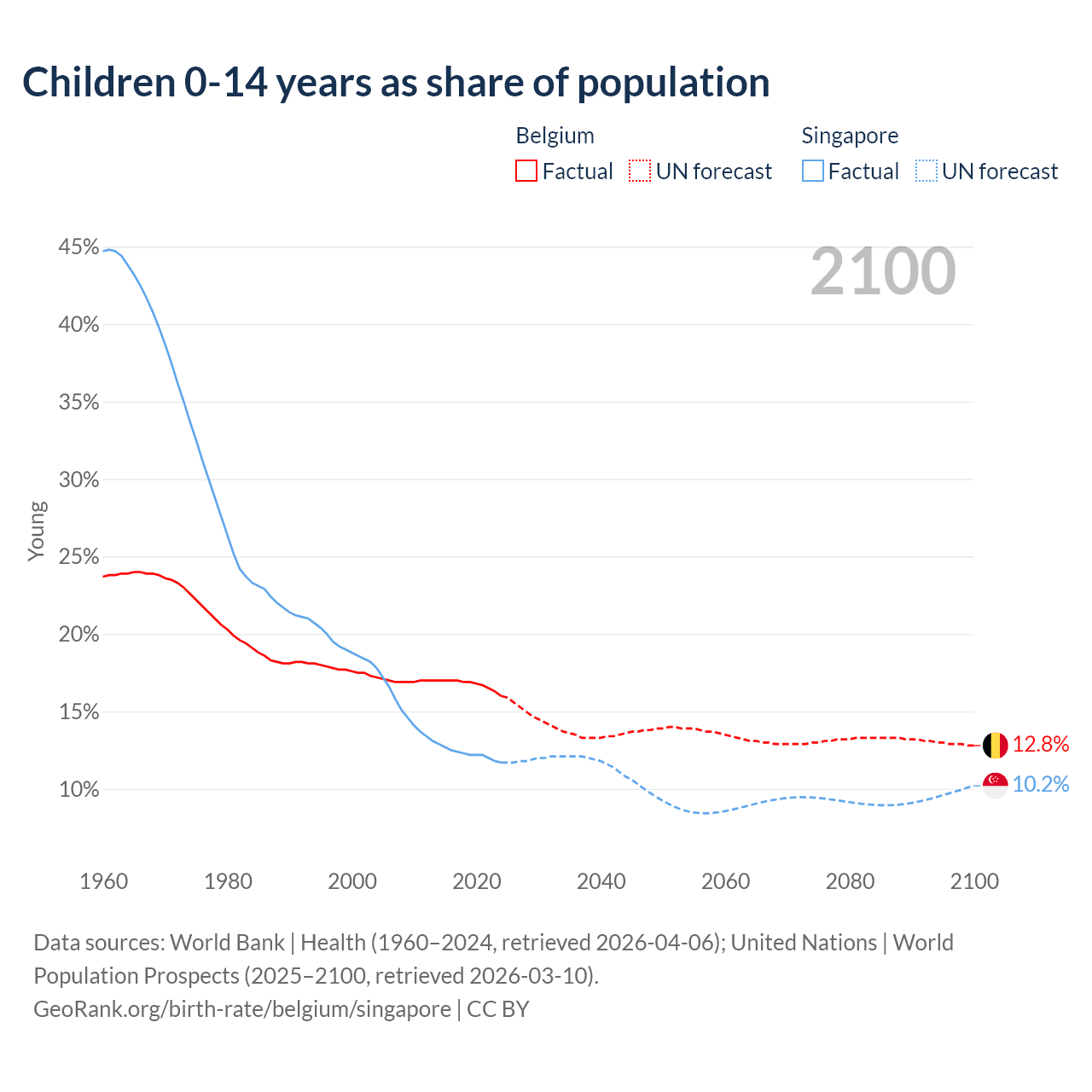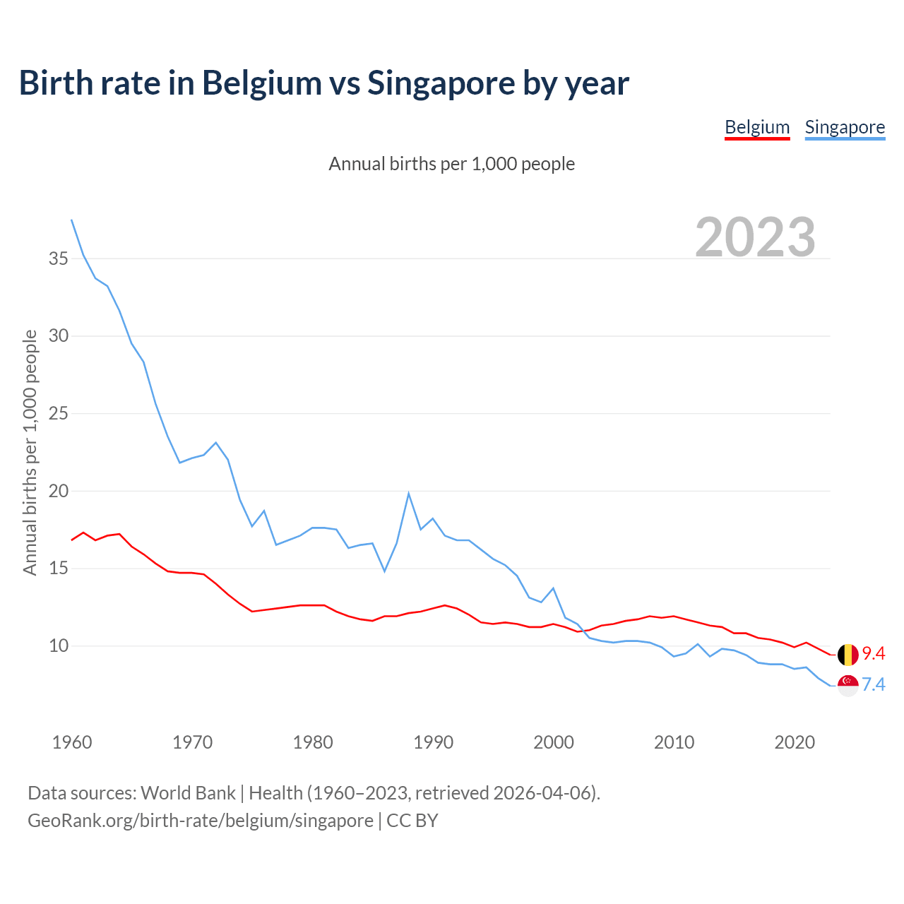 Belgium has an annual birth rate of 9.4 births per 1,000 people, compared to 7.4 for Singapore. The average number of children a woman is expected to have during her lifetime — the fertility rate, is 1.47 in Belgium and 0.97 in Singapore — 34% difference.