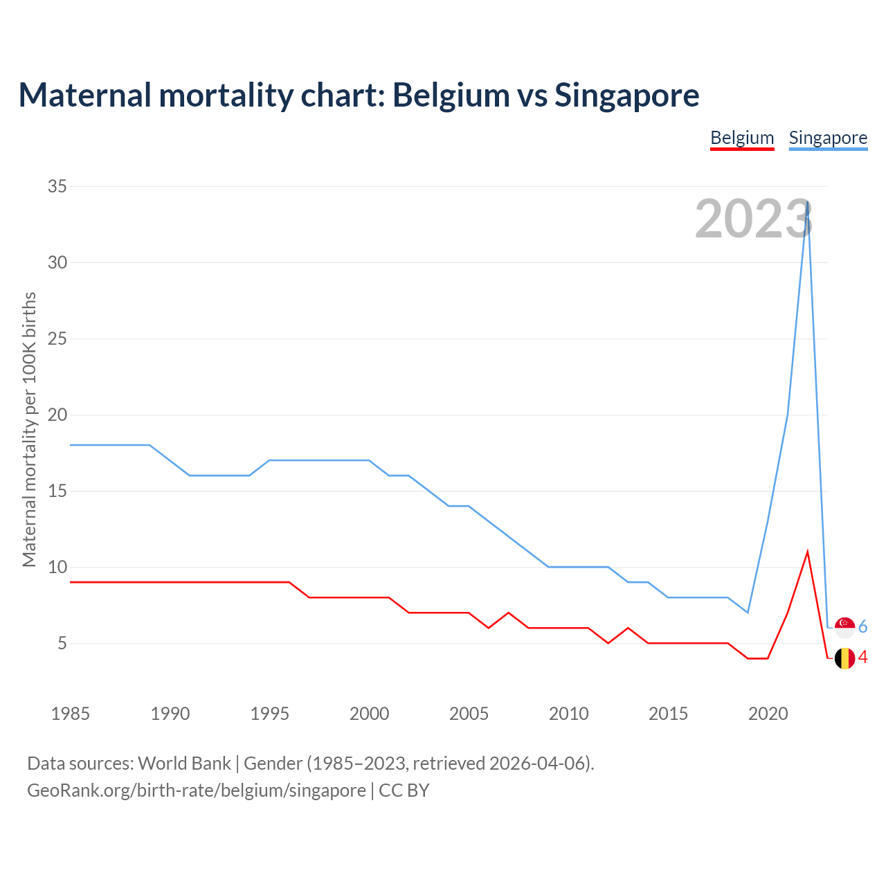 The maternal mortality rate, which is the probability of dying during childbirth or within 42 days of pregnancy termination, is 4 deaths per 100,000 live births in Belgium, compared to 6 deaths in Singapore.