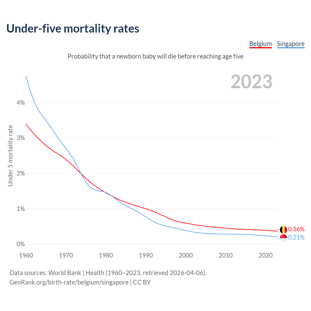 The chance that a newborn baby will die before reaching age five is 0.36% in Belgium and 0.21% in Singapore. Above is a chart with historical data on under-five mortality rates.