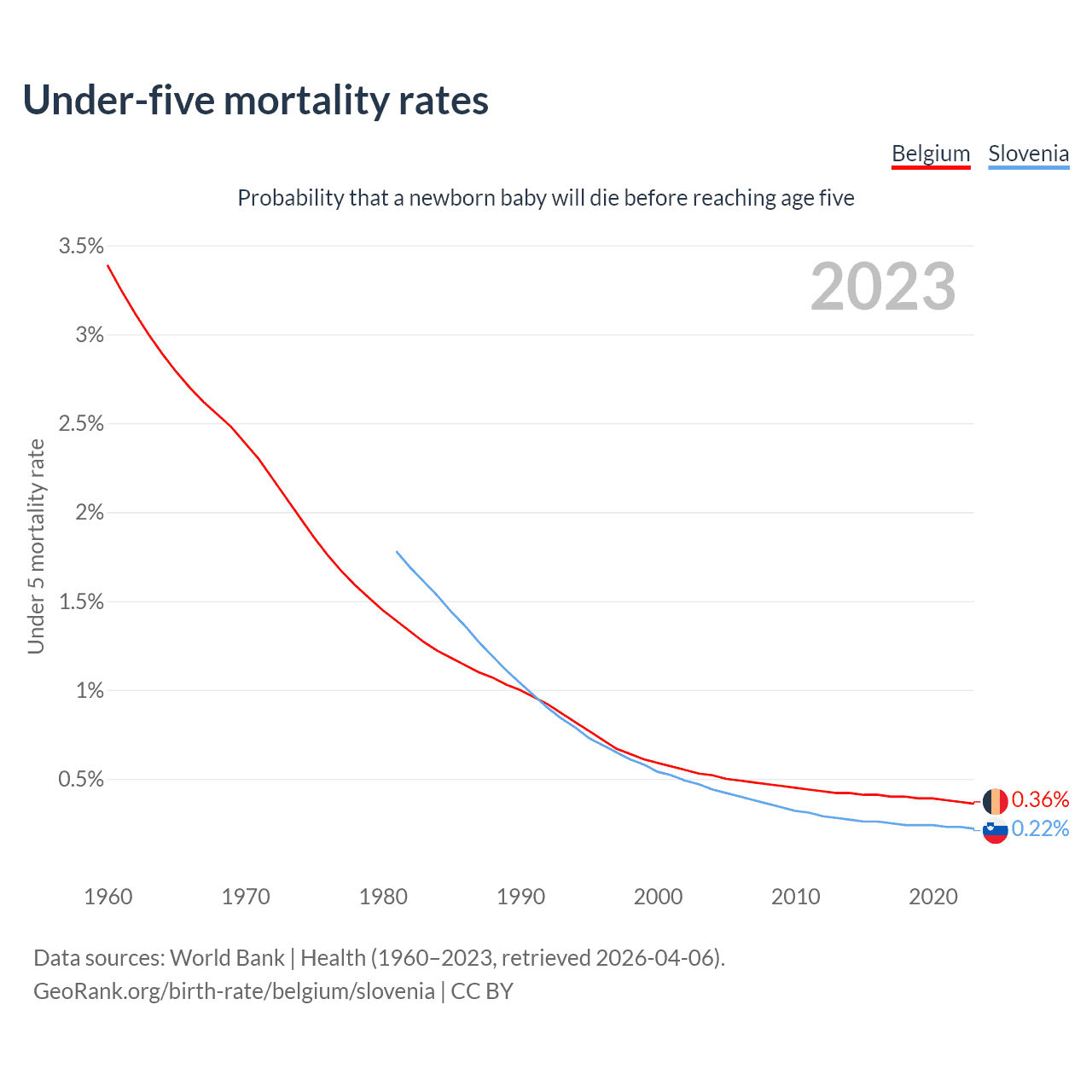 The chance that a newborn baby will die before reaching age five is 0.36% in Belgium and 0.22% in Slovenia. Above is a chart with historical data on under-five mortality rates.