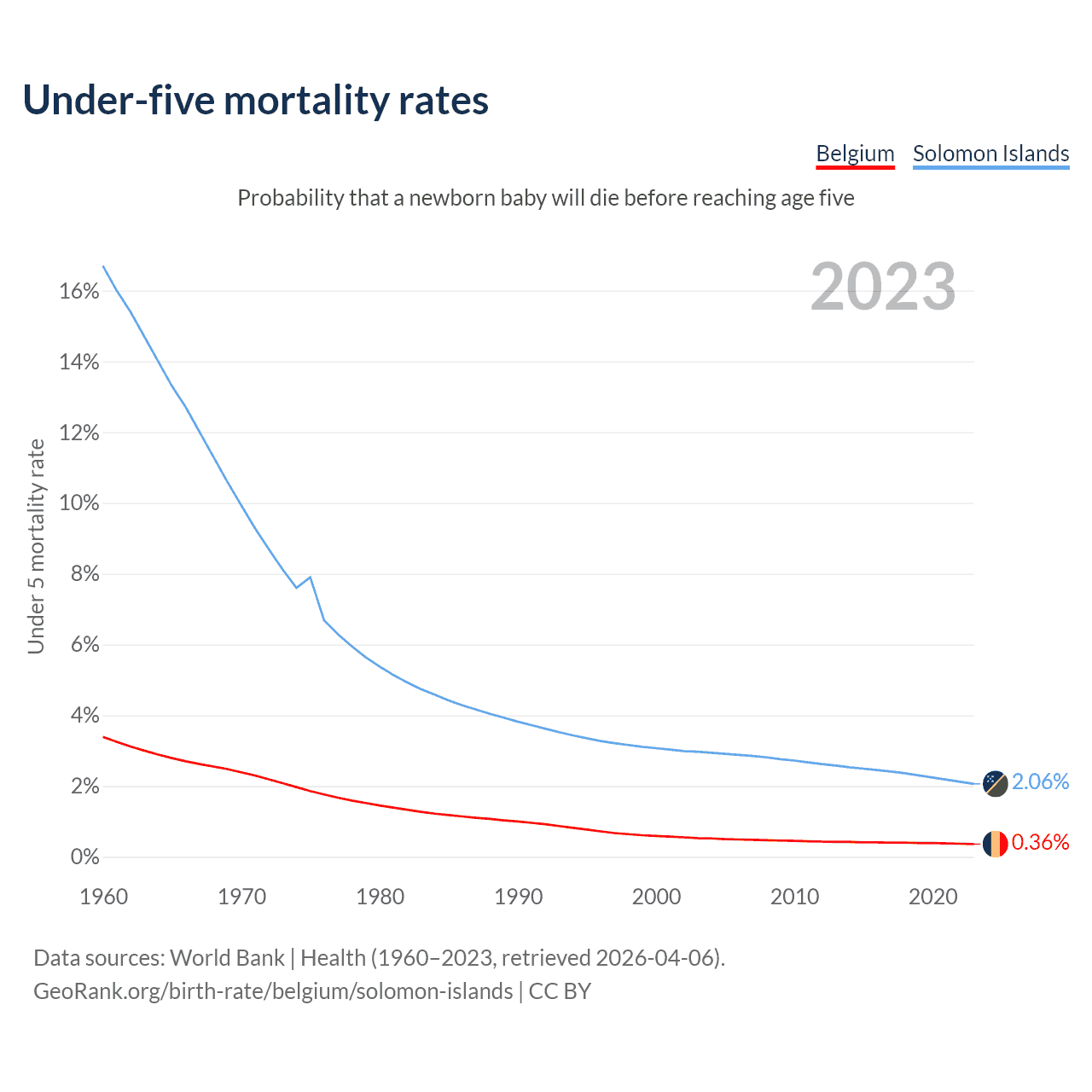 The chance that a newborn baby will die before reaching age five is 0.36% in Belgium and 2.06% in the Solomon Islands. Above is a chart with historical data on under-five mortality rates.