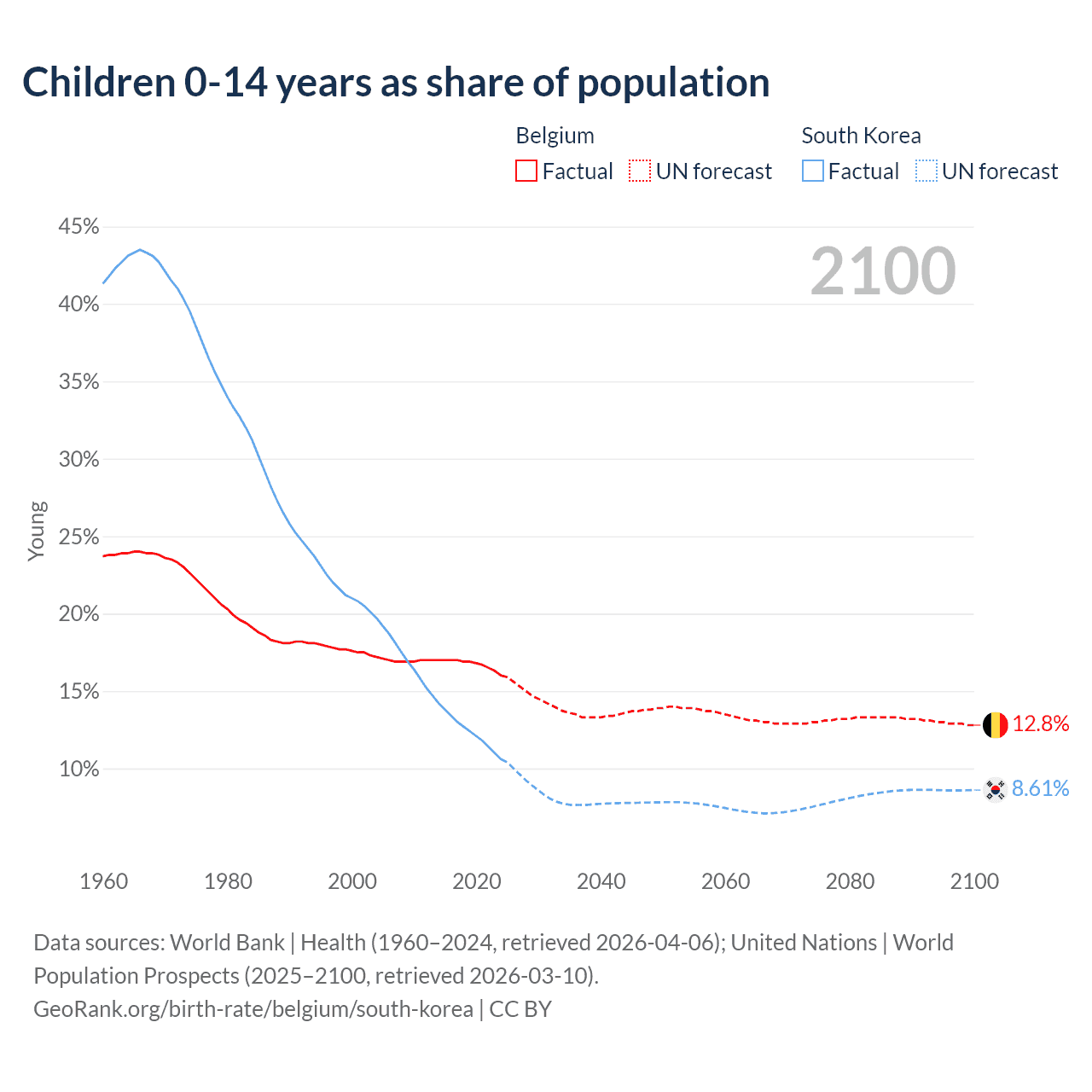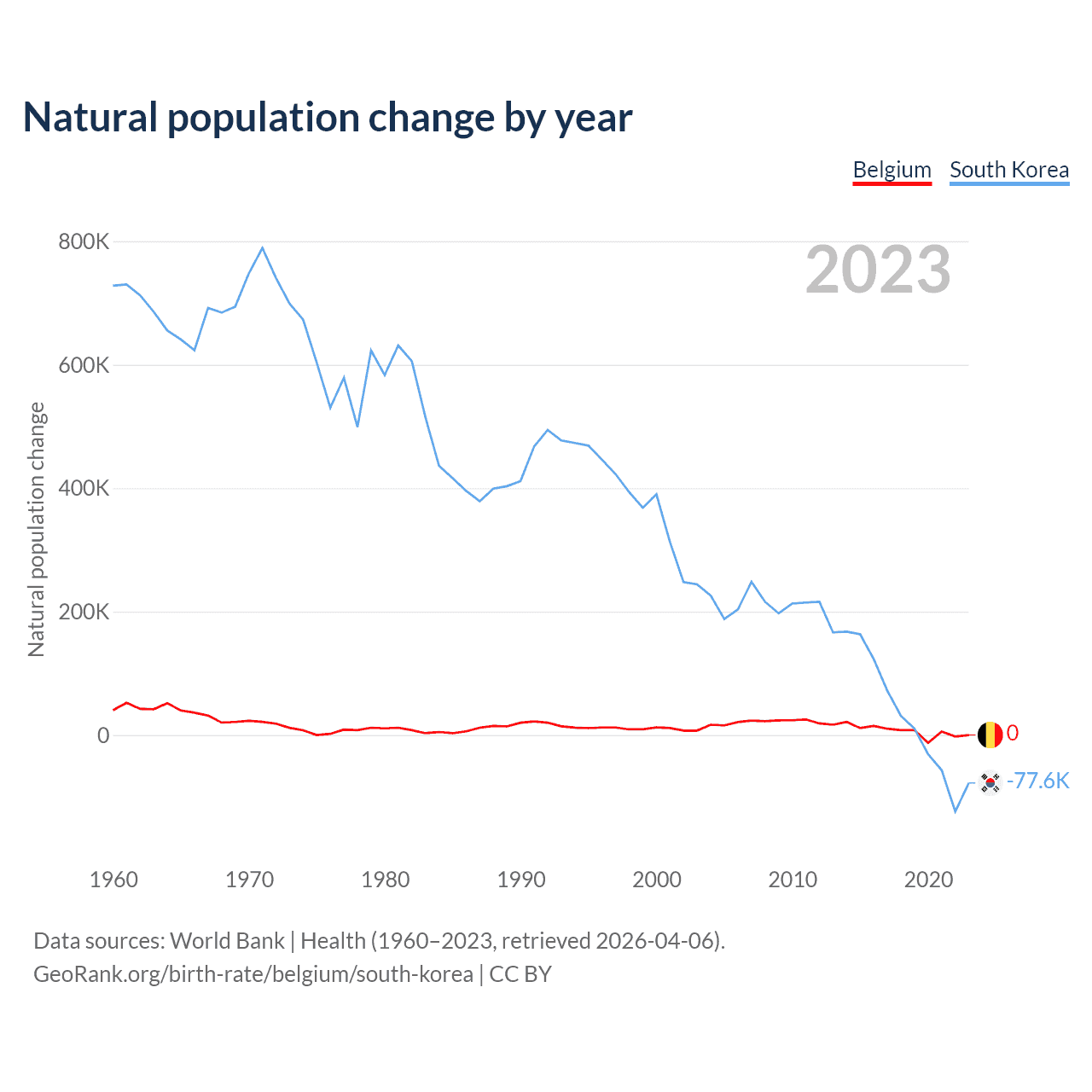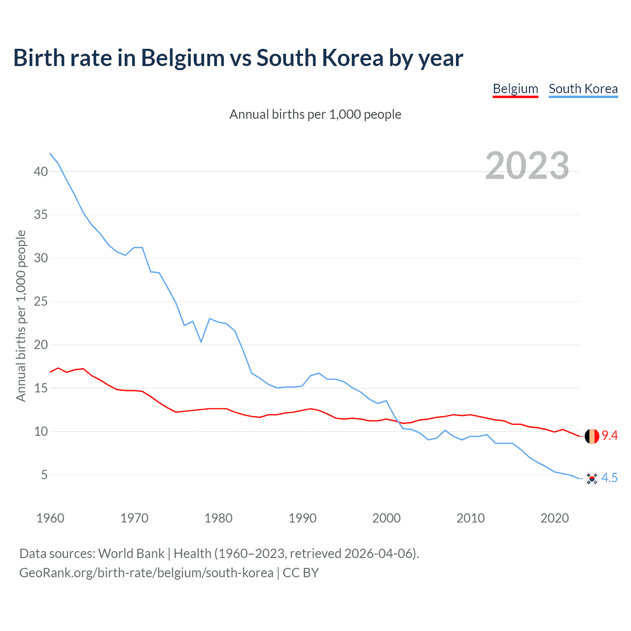 Belgium has an annual birth rate of 9.4 births per 1,000 people, compared to 4.5 for South Korea. The average number of children a woman is expected to have during her lifetime — the fertility rate, is 1.47 in Belgium and 0.72 in South Korea — 51% difference.