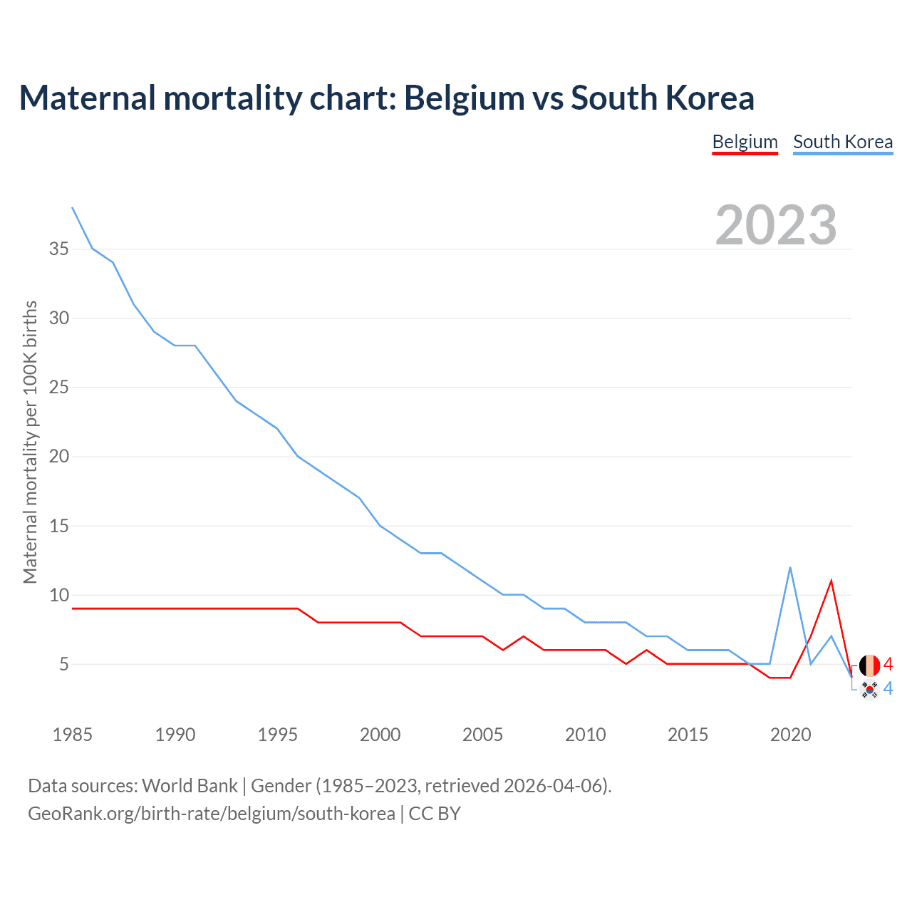 The maternal mortality rate, which is the probability of dying during childbirth or within 42 days of pregnancy termination, is 4 deaths per 100,000 live births in Belgium, compared to 4 deaths in South Korea.