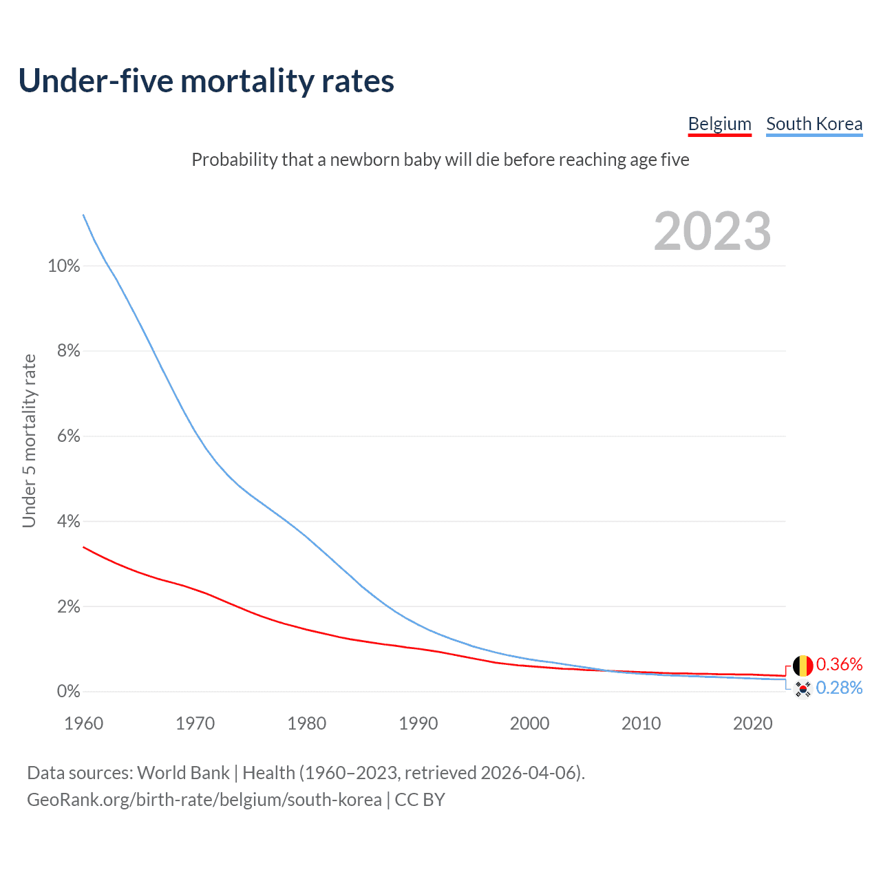 The chance that a newborn baby will die before reaching age five is 0.36% in Belgium and 0.28% in South Korea. Above is a chart with historical data on under-five mortality rates.