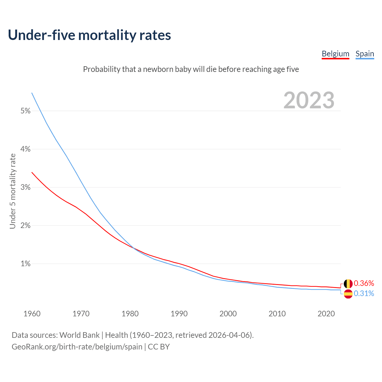 The chance that a newborn baby will die before reaching age five is 0.36% in Belgium and 0.31% in Spain. Above is a chart with historical data on under-five mortality rates.