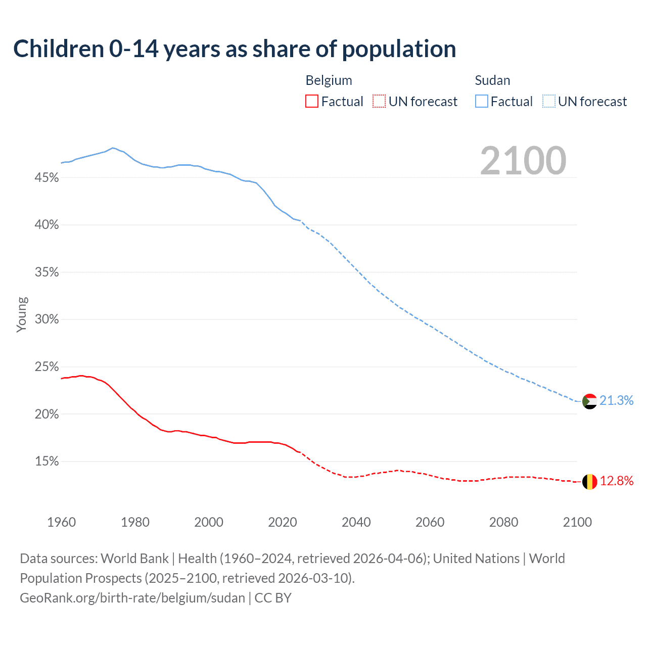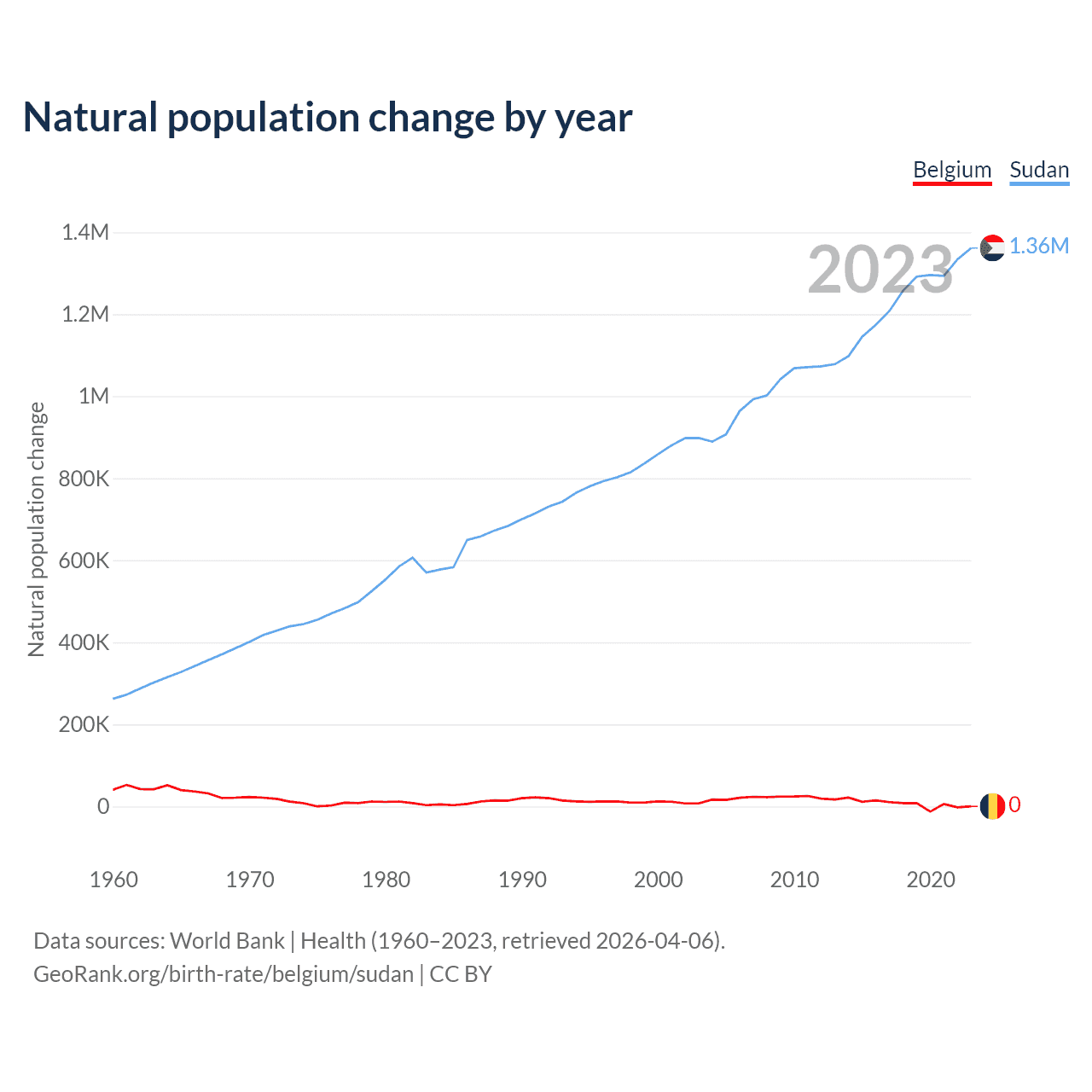 Belgium has an annual birth rate of 9.4 births per 1,000 people, compared to 33.6 for Sudan. The average number of children a woman is expected to have during her lifetime — the fertility rate, is 1.47 in Belgium and 4.32 in Sudan — 194.1% difference.