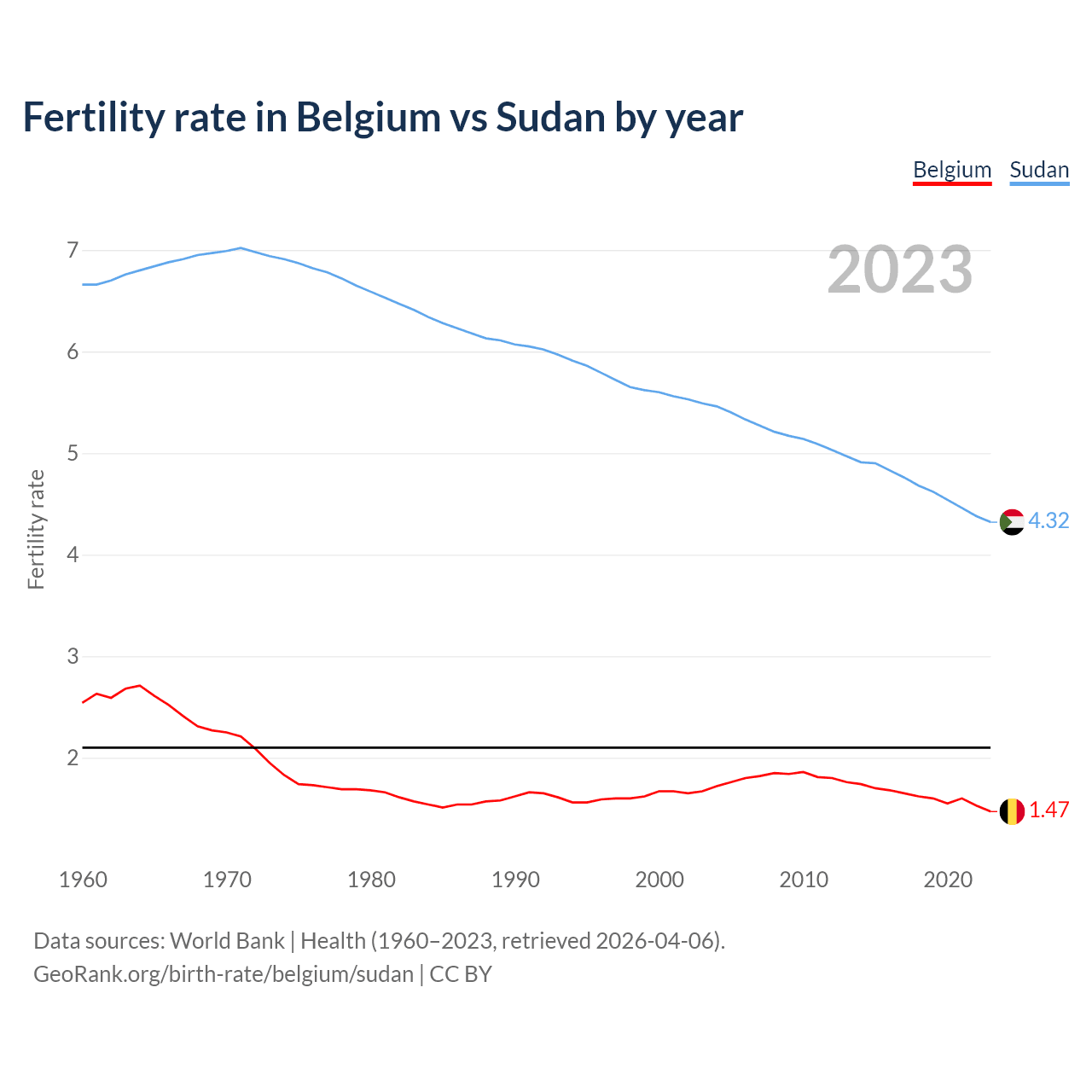 According to the latest available data on birth rates, the fertility rate in Belgium was 1.47 children per woman in 2023, compared to 4.32 in Sudan in 2023. The replacement level is considered to be 2.1 children per woman.