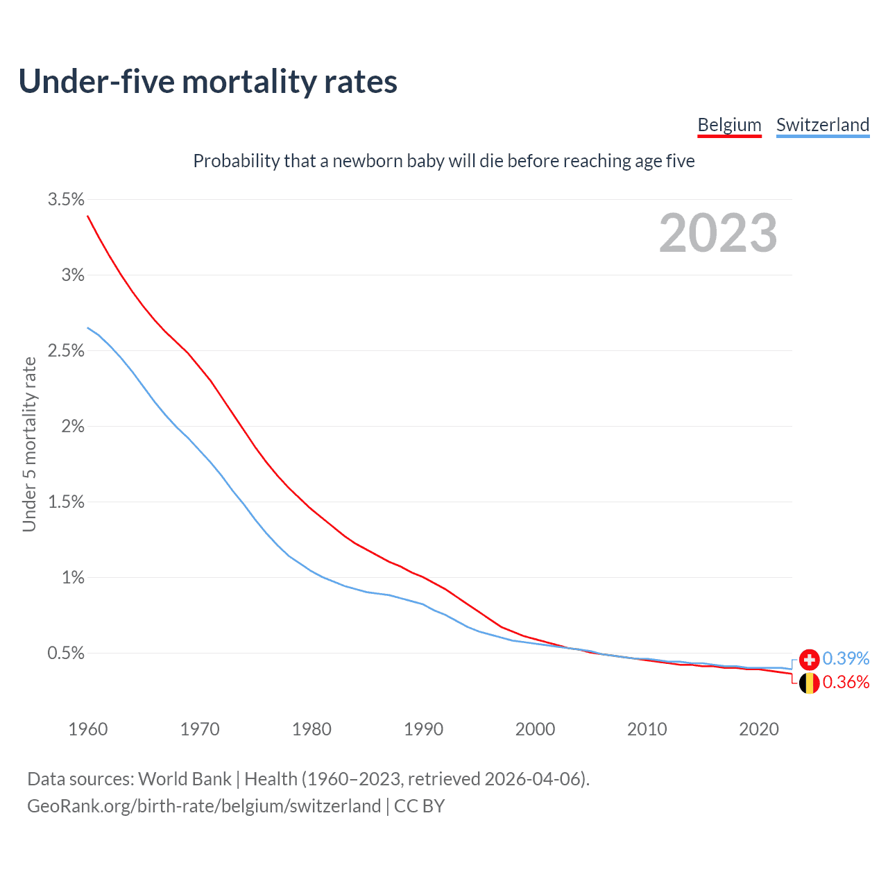 The chance that a newborn baby will die before reaching age five is 0.36% in Belgium and 0.39% in Switzerland. Above is a chart with historical data on under-five mortality rates.