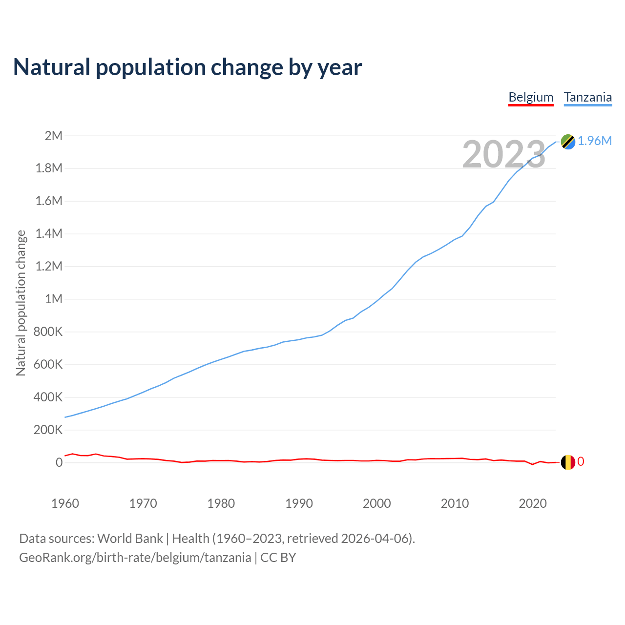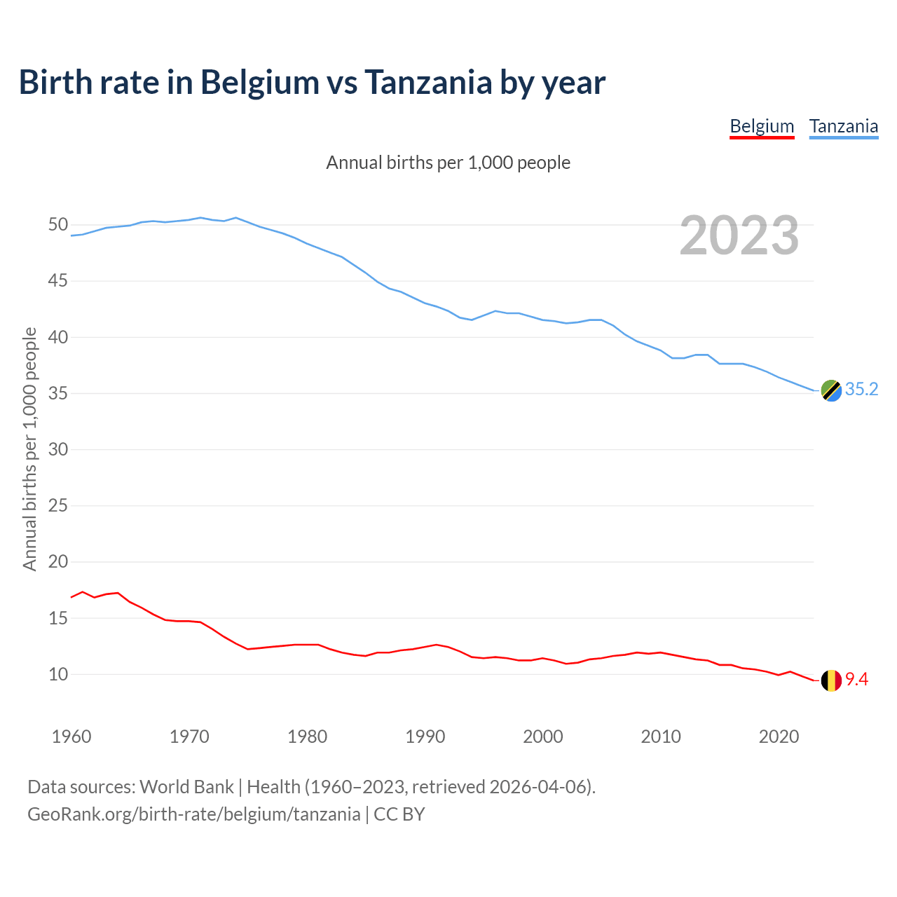 Belgium has an annual birth rate of 9.4 births per 1,000 people, compared to 35.2 for Tanzania. The average number of children a woman is expected to have during her lifetime — the fertility rate, is 1.47 in Belgium and 4.61 in Tanzania — 213.3% difference.