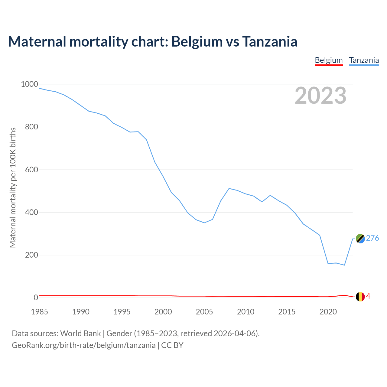 The maternal mortality rate, which is the probability of dying during childbirth or within 42 days of pregnancy termination, is 4 deaths per 100,000 live births in Belgium, compared to 276 deaths in Tanzania.