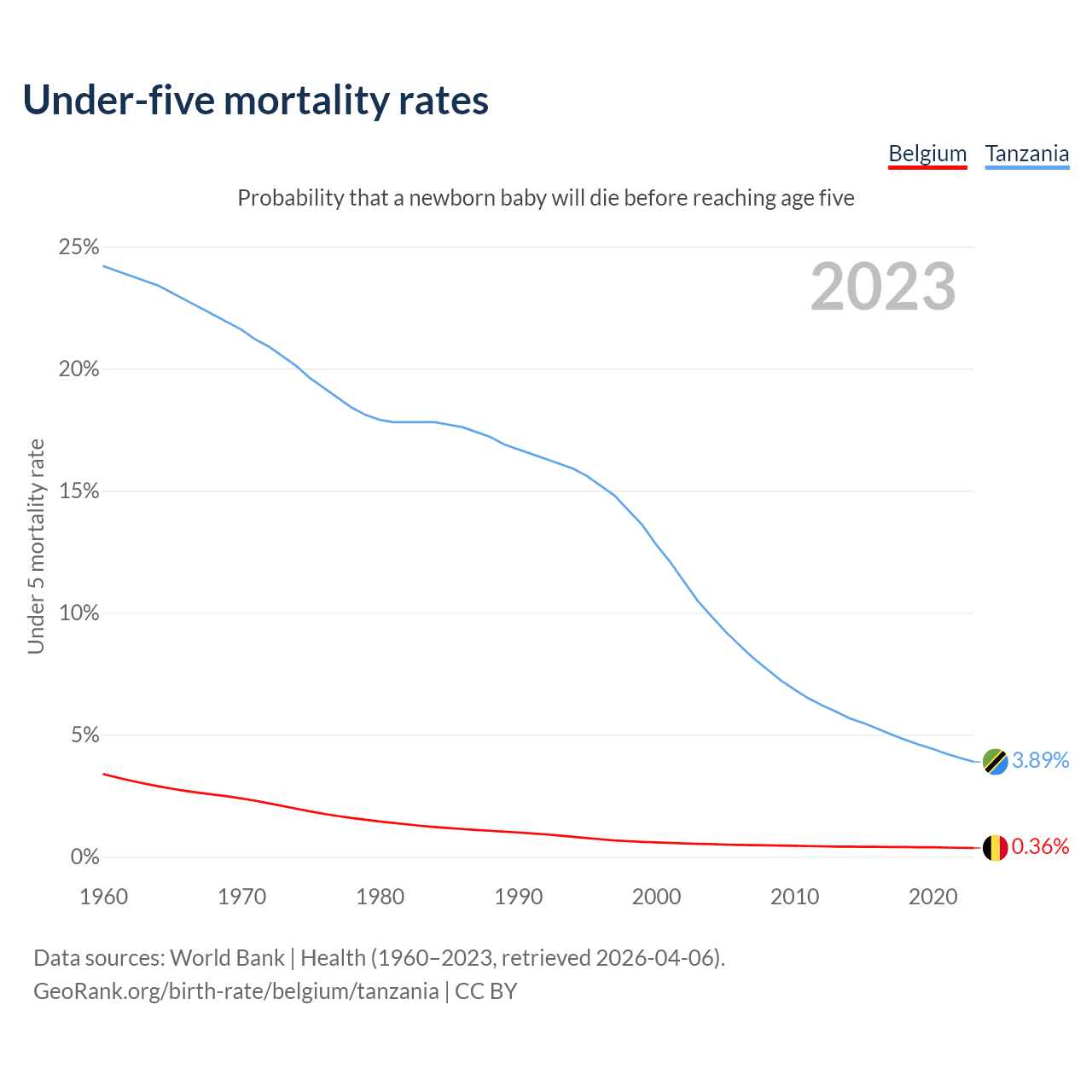 The chance that a newborn baby will die before reaching age five is 0.36% in Belgium and 3.89% in Tanzania. Above is a chart with historical data on under-five mortality rates.