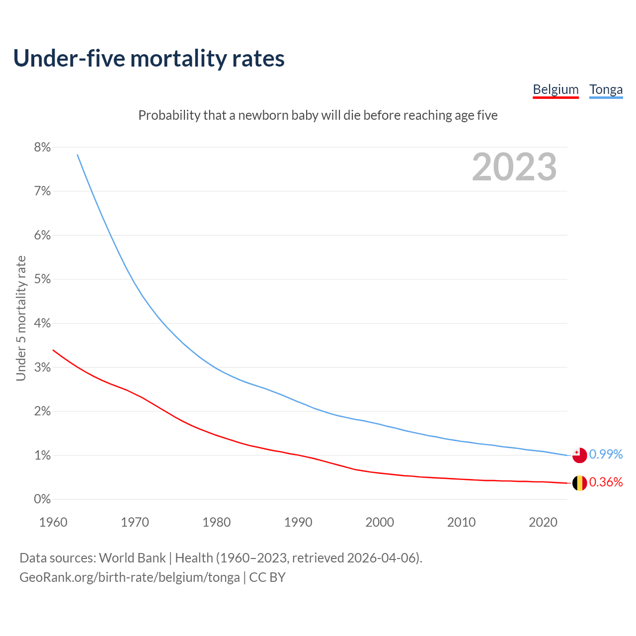 The chance that a newborn baby will die before reaching age five is 0.36% in Belgium and 0.99% in Tonga. Above is a chart with historical data on under-five mortality rates.