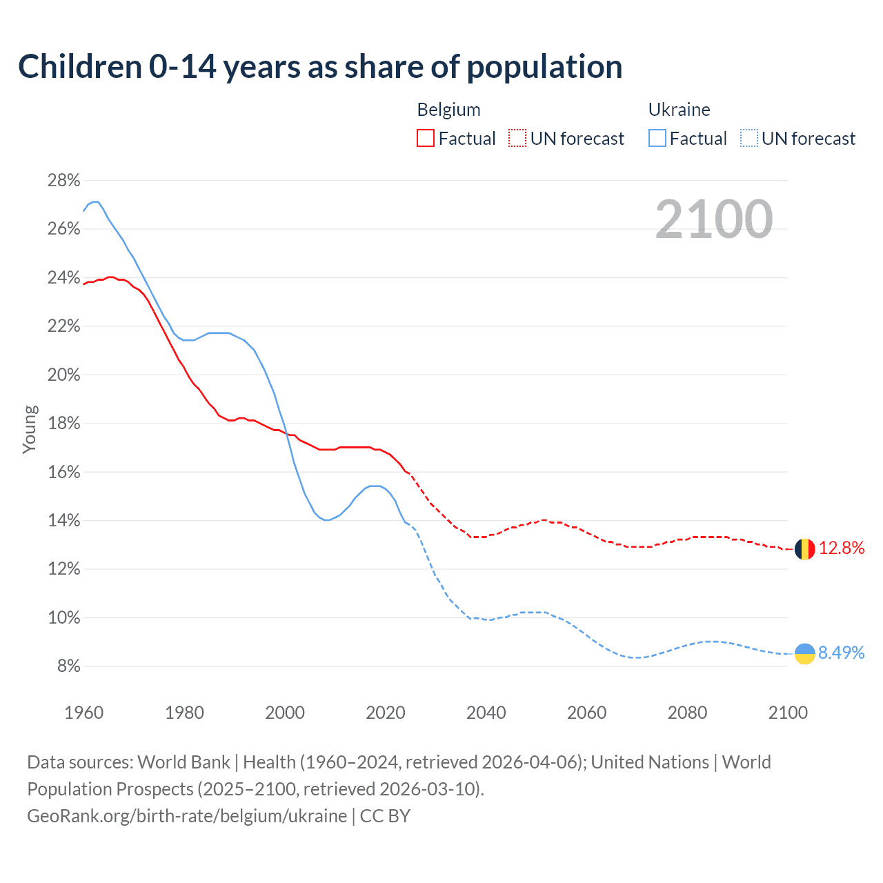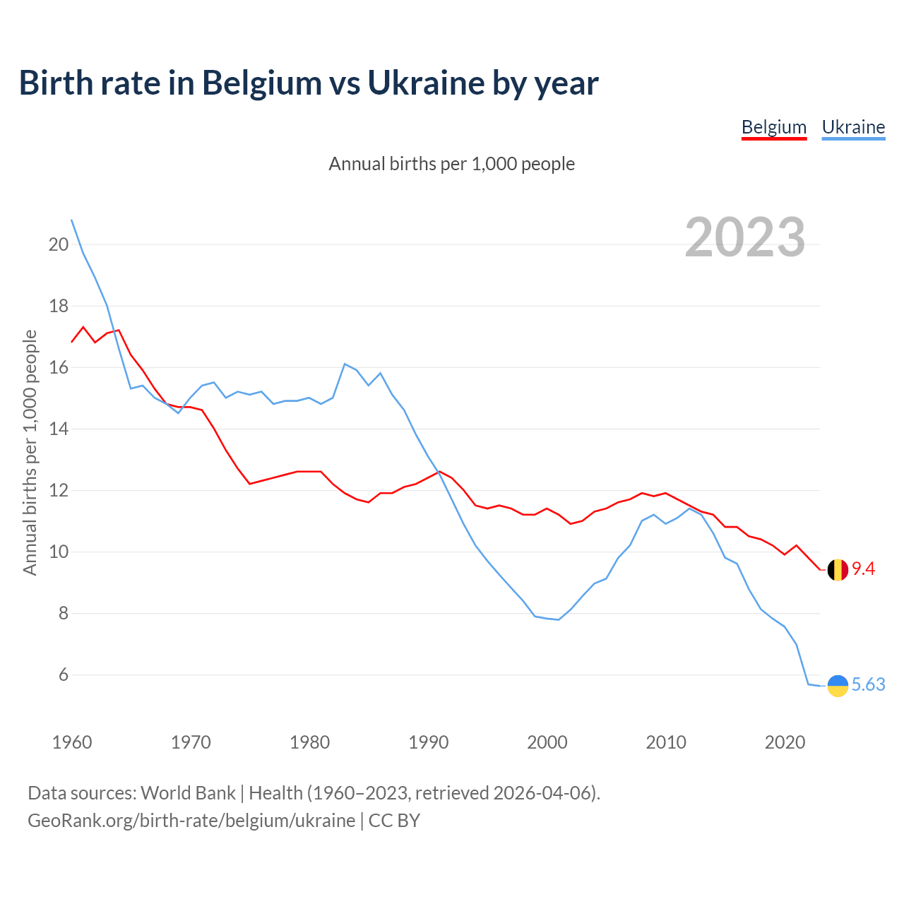 Belgium has an annual birth rate of 9.4 births per 1,000 people, compared to 5.63 for Ukraine. The average number of children a woman is expected to have during her lifetime — the fertility rate, is 1.47 in Belgium and 0.98 in Ukraine — 33.5% difference.