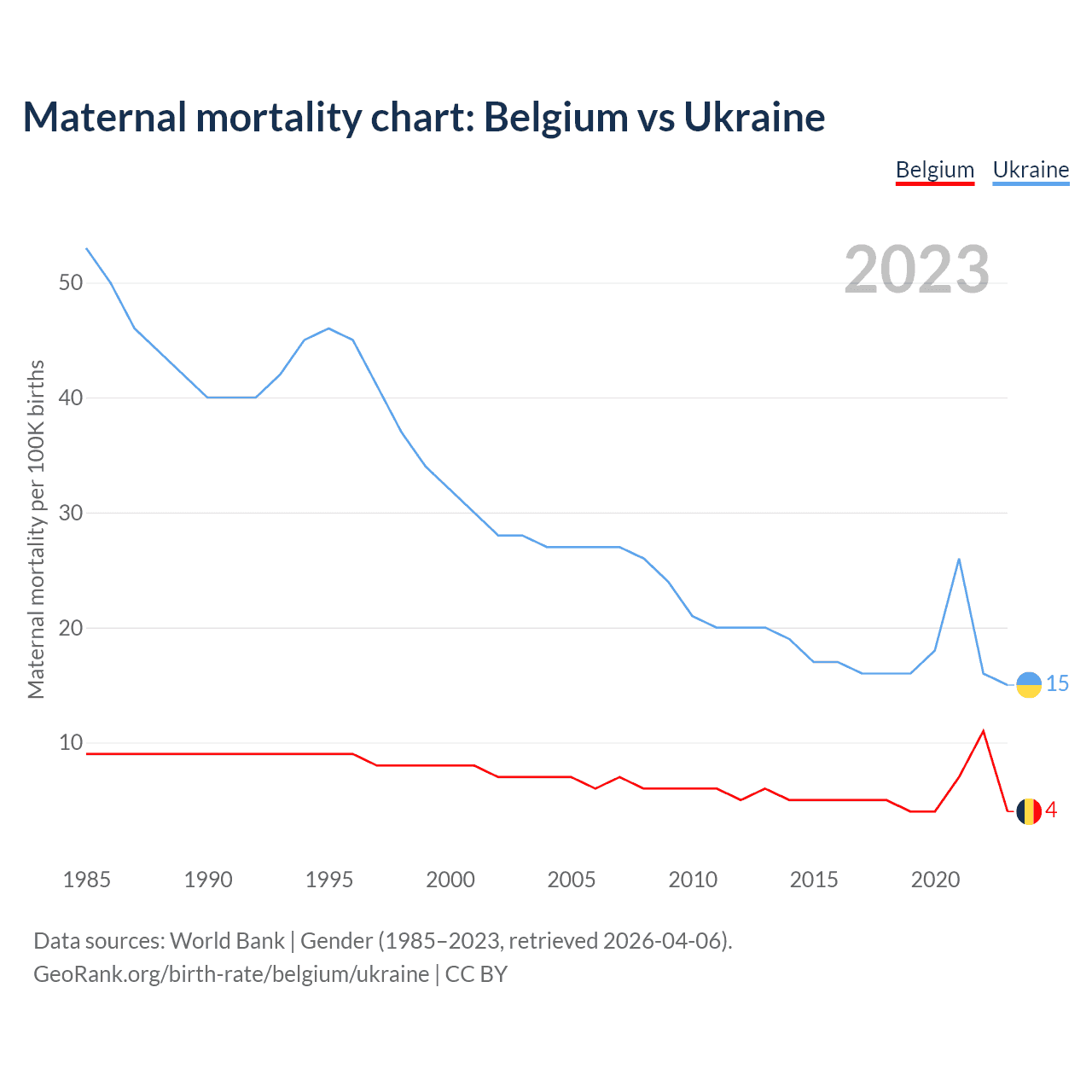 The maternal mortality rate, which is the probability of dying during childbirth or within 42 days of pregnancy termination, is 4 deaths per 100,000 live births in Belgium, compared to 15 deaths in Ukraine.