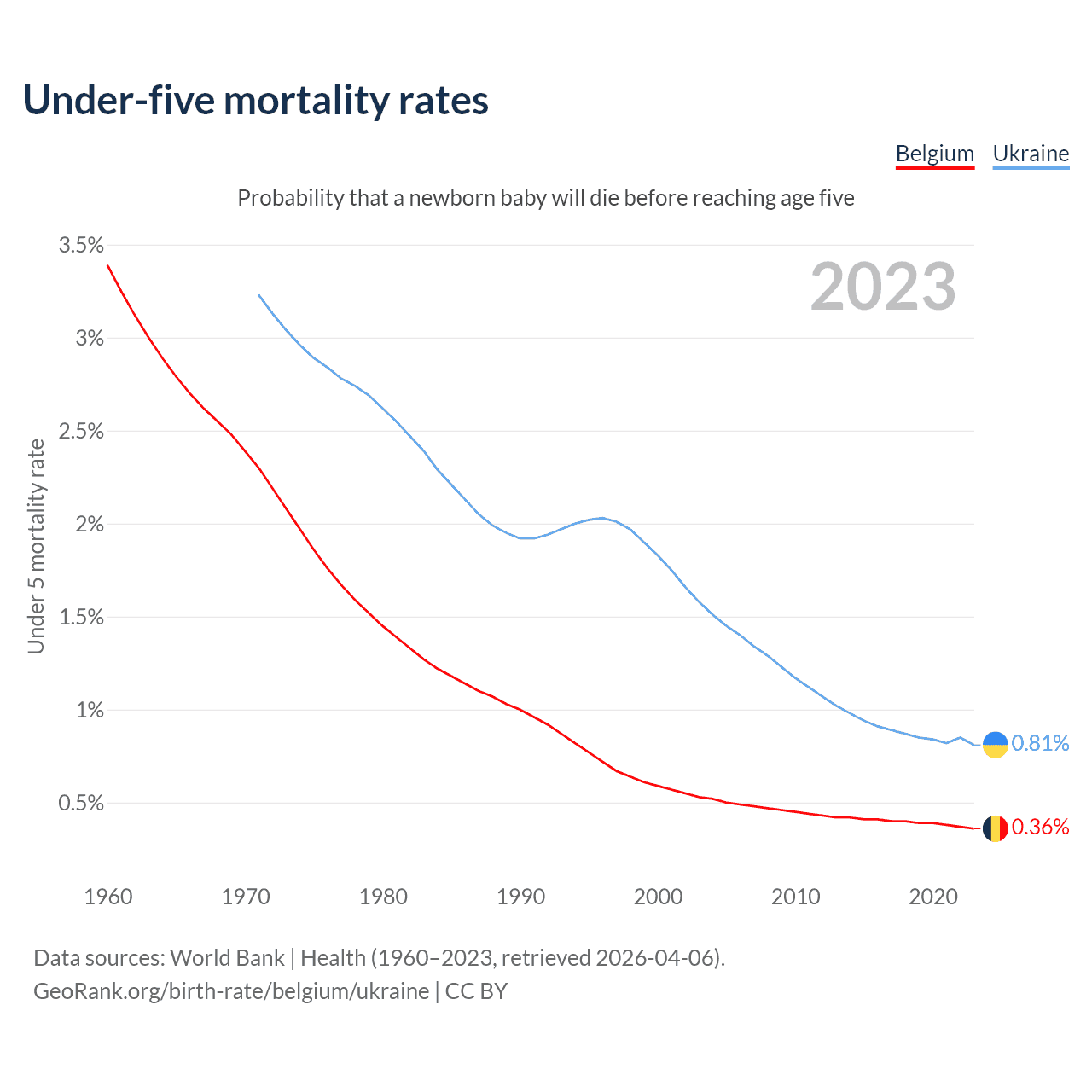 The chance that a newborn baby will die before reaching age five is 0.36% in Belgium and 0.81% in Ukraine. Above is a chart with historical data on under-five mortality rates.