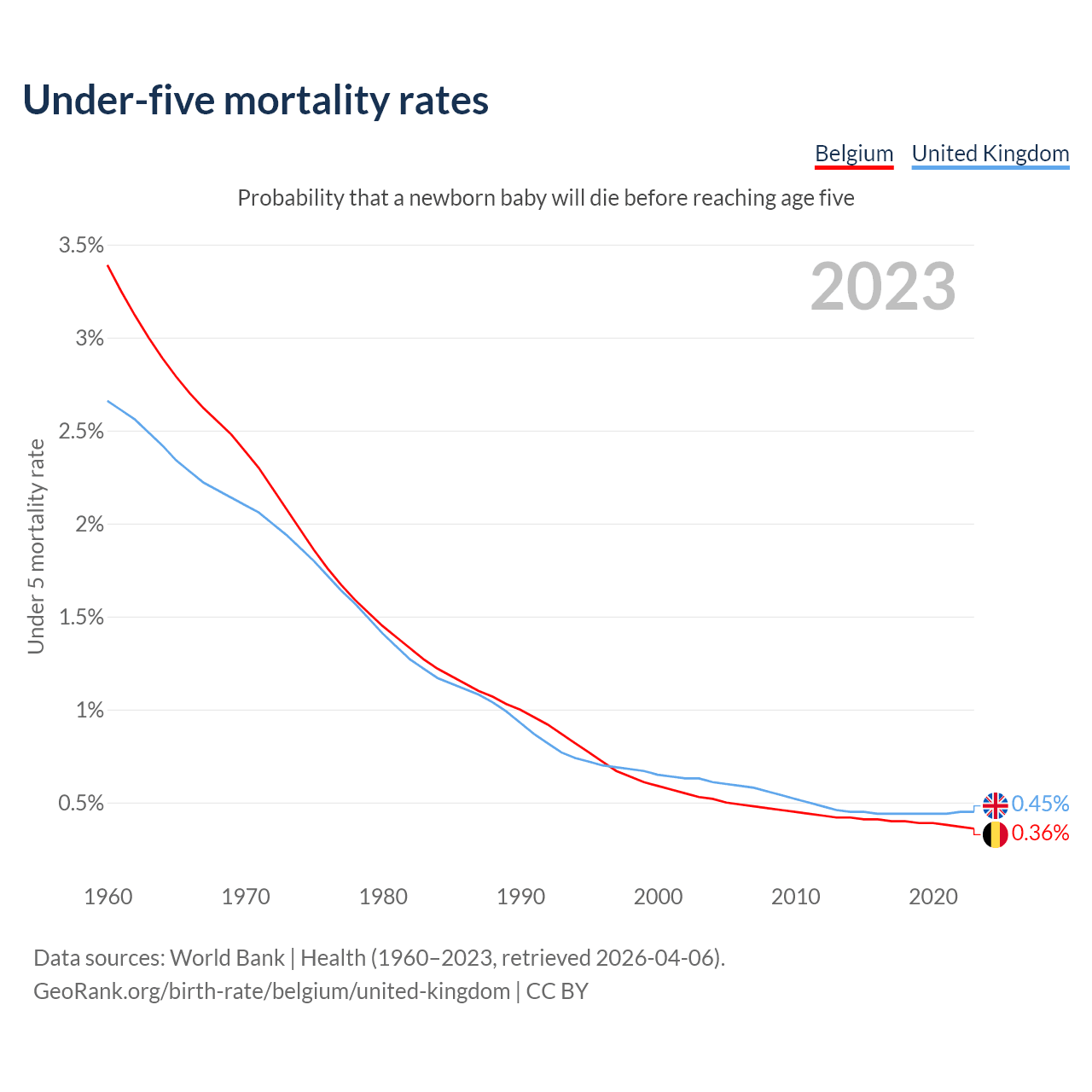 The chance that a newborn baby will die before reaching age five is 0.36% in Belgium and 0.45% in the United Kingdom. Above is a chart with historical data on under-five mortality rates.