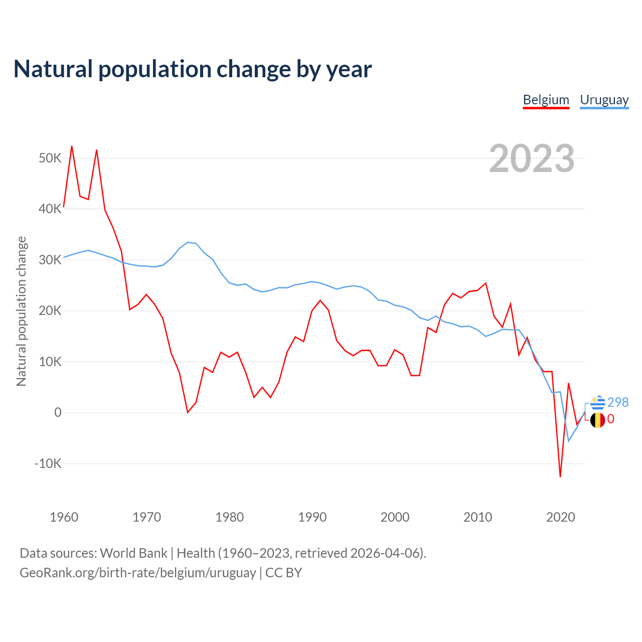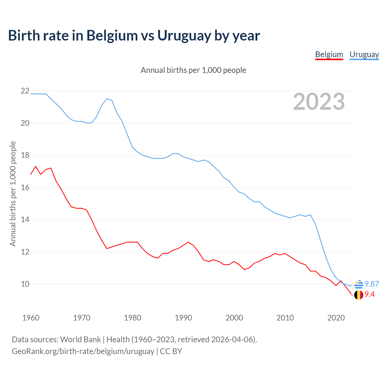 Belgium has an annual birth rate of 9.4 births per 1,000 people, compared to 9.87 for Uruguay. The average number of children a woman is expected to have during her lifetime — the fertility rate, is 1.47 in Belgium and 1.41 in Uruguay — 4.15% difference.