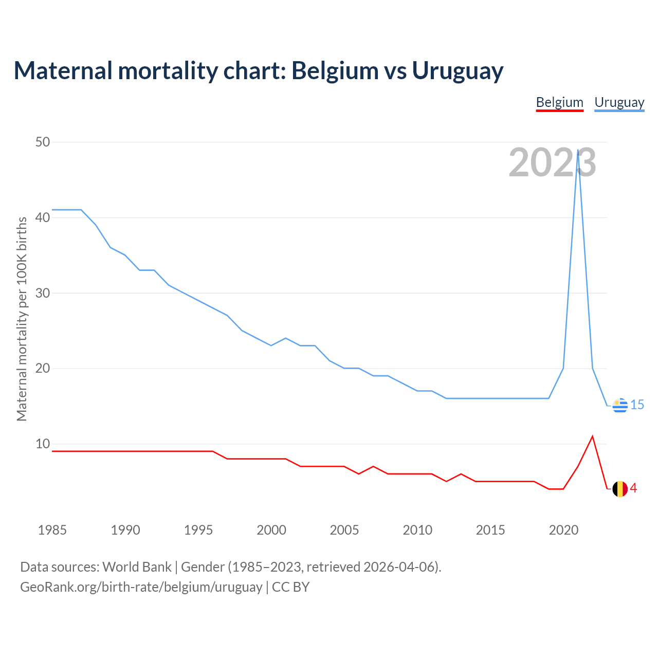 The maternal mortality rate, which is the probability of dying during childbirth or within 42 days of pregnancy termination, is 4 deaths per 100,000 live births in Belgium, compared to 15 deaths in Uruguay.