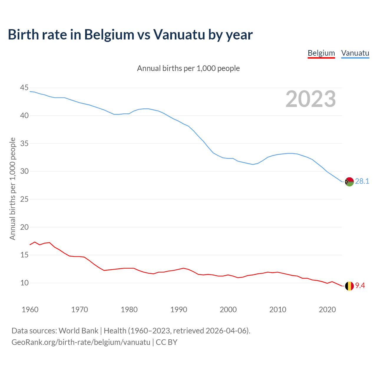 Belgium has an annual birth rate of 9.4 births per 1,000 people, compared to 28.1 for Vanuatu. The average number of children a woman is expected to have during her lifetime — the fertility rate, is 1.47 in Belgium and 3.6 in Vanuatu — 144.6% difference.