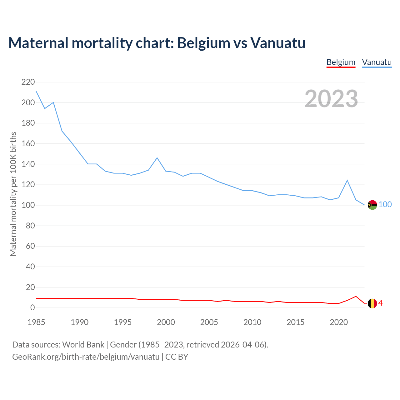 The maternal mortality rate, which is the probability of dying during childbirth or within 42 days of pregnancy termination, is 4 deaths per 100,000 live births in Belgium, compared to 100 deaths in Vanuatu.