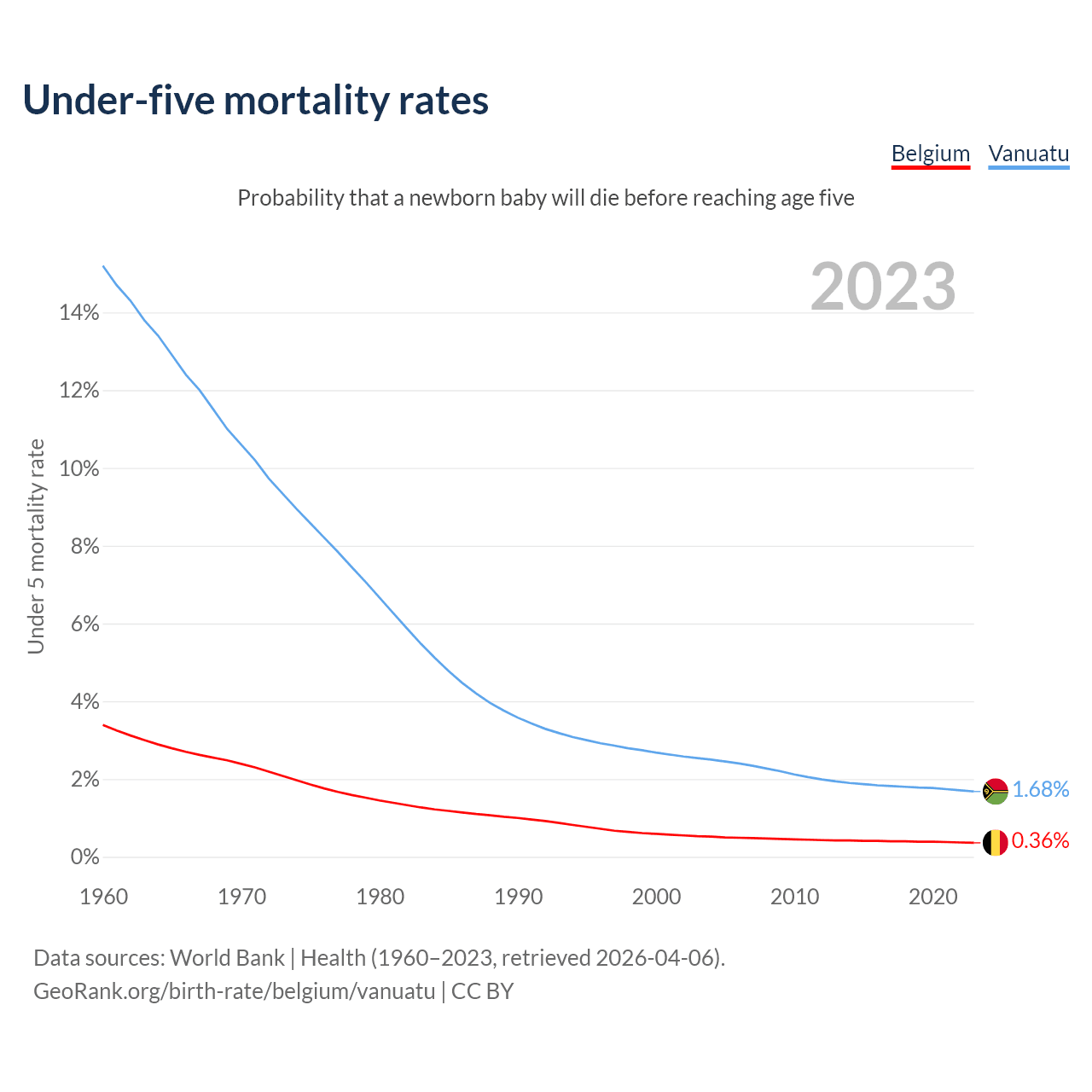 The chance that a newborn baby will die before reaching age five is 0.36% in Belgium and 1.68% in Vanuatu. Above is a chart with historical data on under-five mortality rates.
