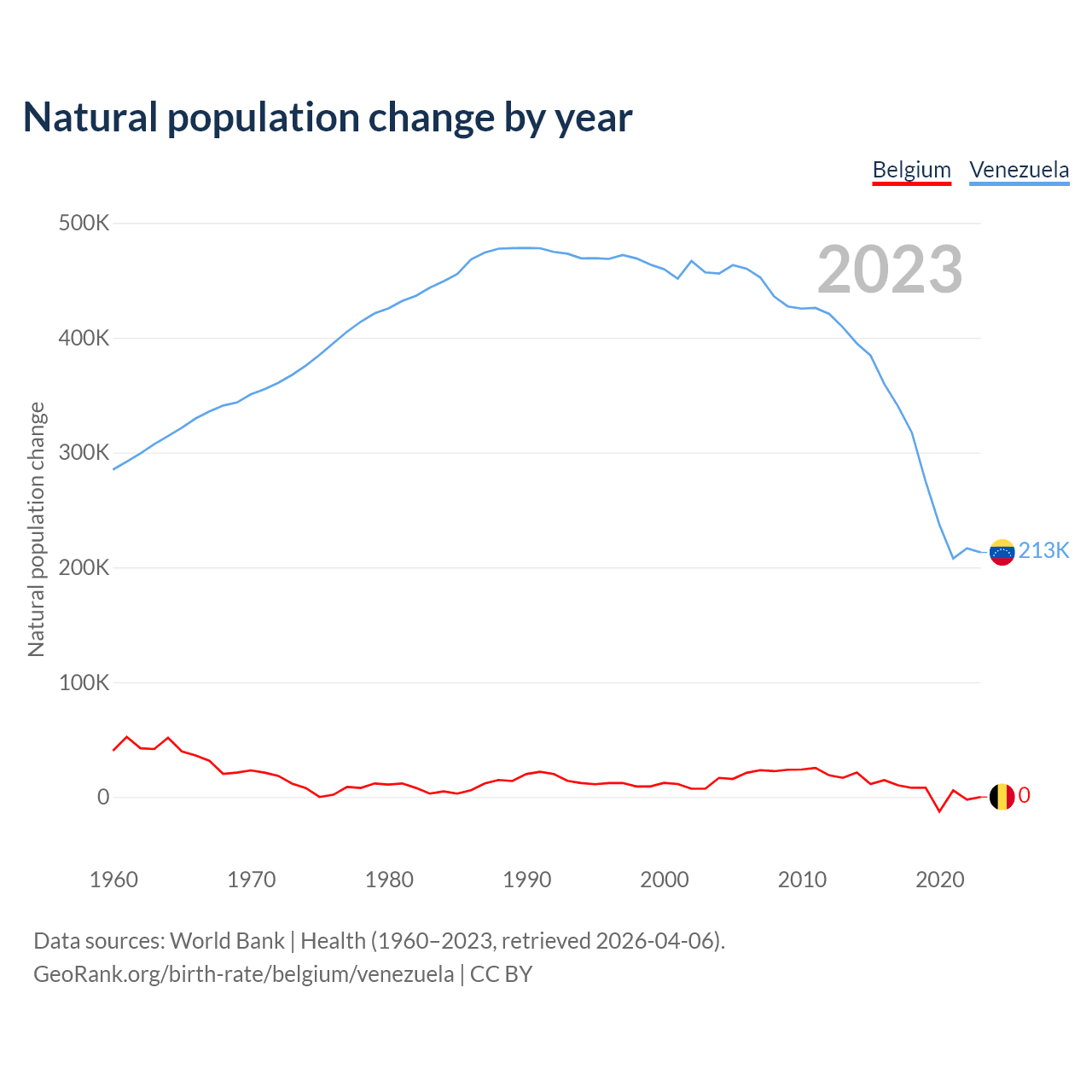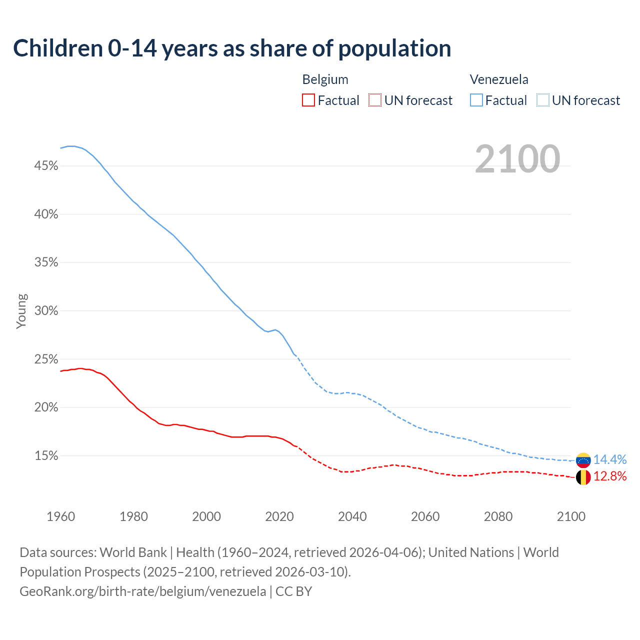According to the latest available data on birth rates, the fertility rate in Belgium was 1.47 children per woman in 2023, compared to 2.08 in Venezuela in 2023. The replacement level is considered to be 2.1 children per woman.