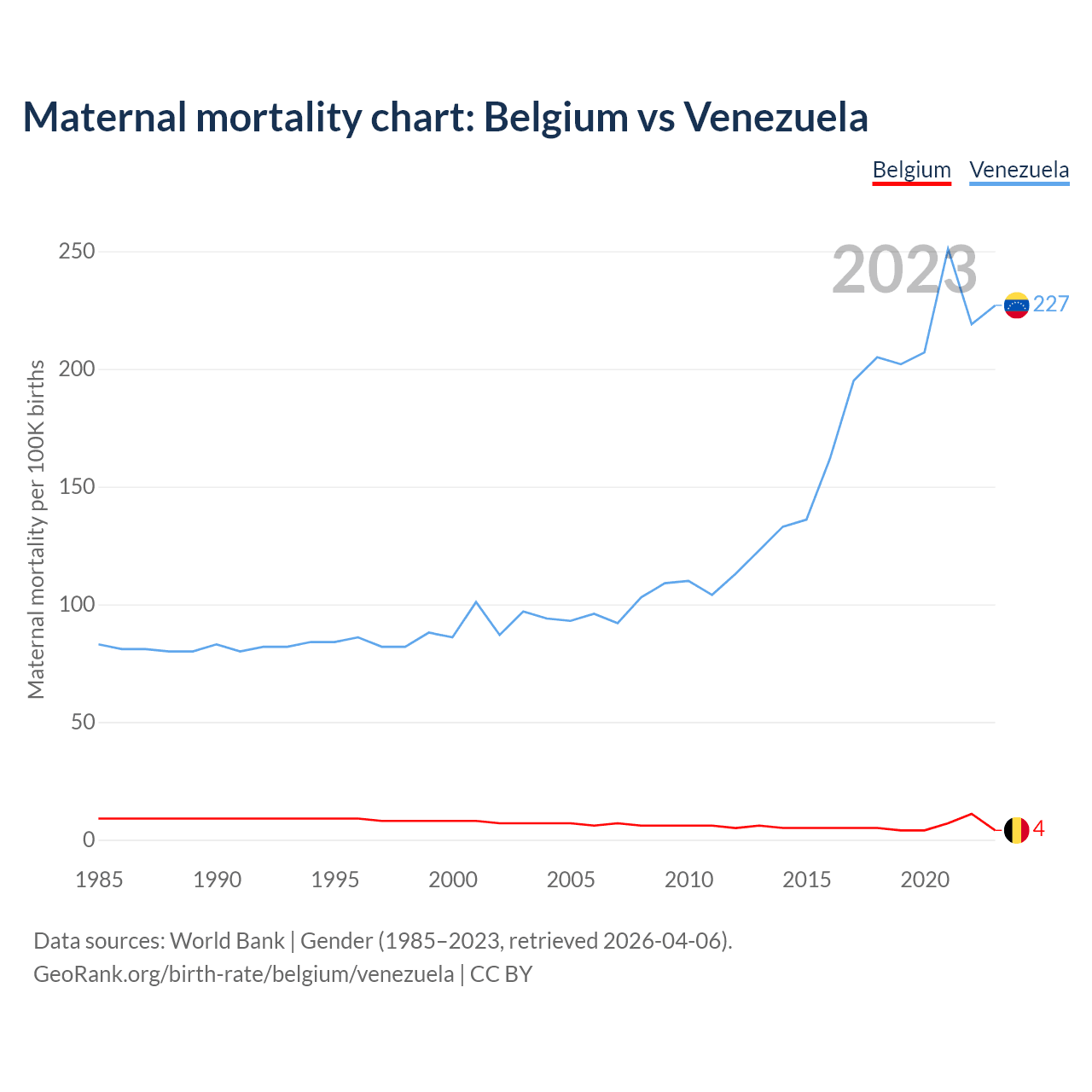 The maternal mortality rate, which is the probability of dying during childbirth or within 42 days of pregnancy termination, is 4 deaths per 100,000 live births in Belgium, compared to 227 deaths in Venezuela.