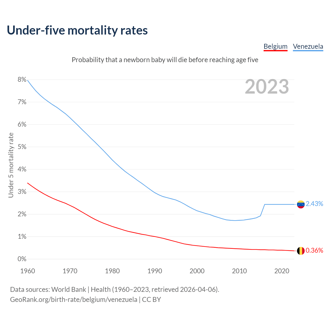 The chance that a newborn baby will die before reaching age five is 0.36% in Belgium and 2.43% in Venezuela. Above is a chart with historical data on under-five mortality rates.