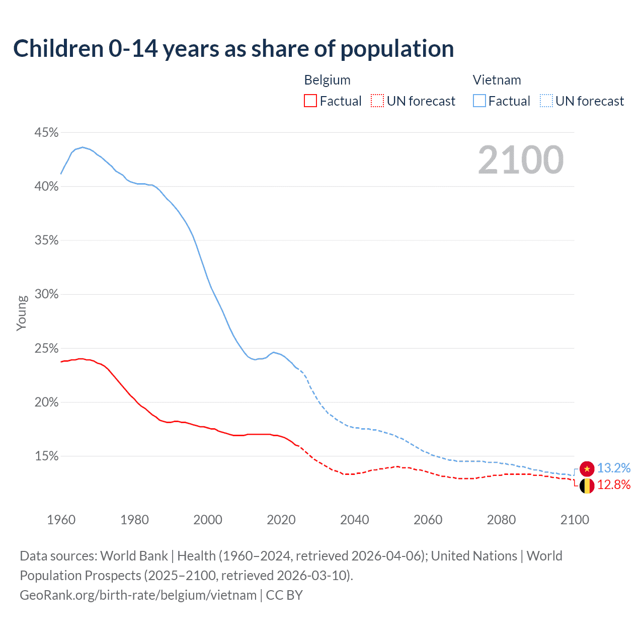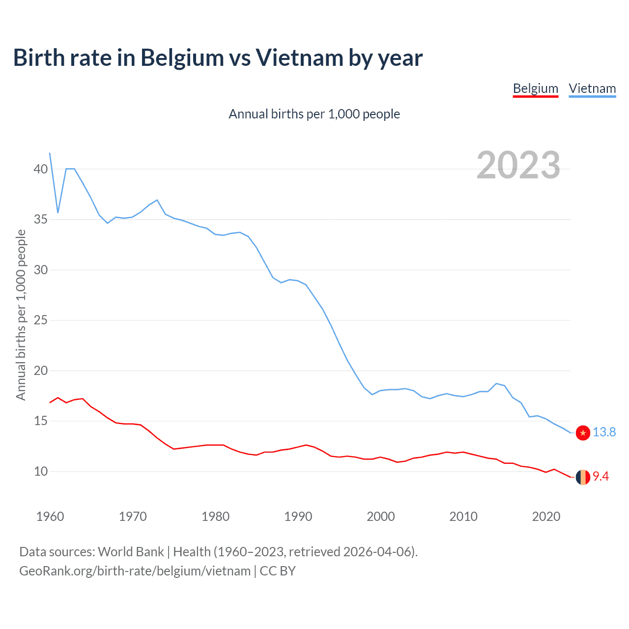 According to the latest available data on birth rates, the fertility rate in Belgium was 1.47 children per woman in 2023, compared to 1.91 in Vietnam in 2023. The replacement level is considered to be 2.1 children per woman.