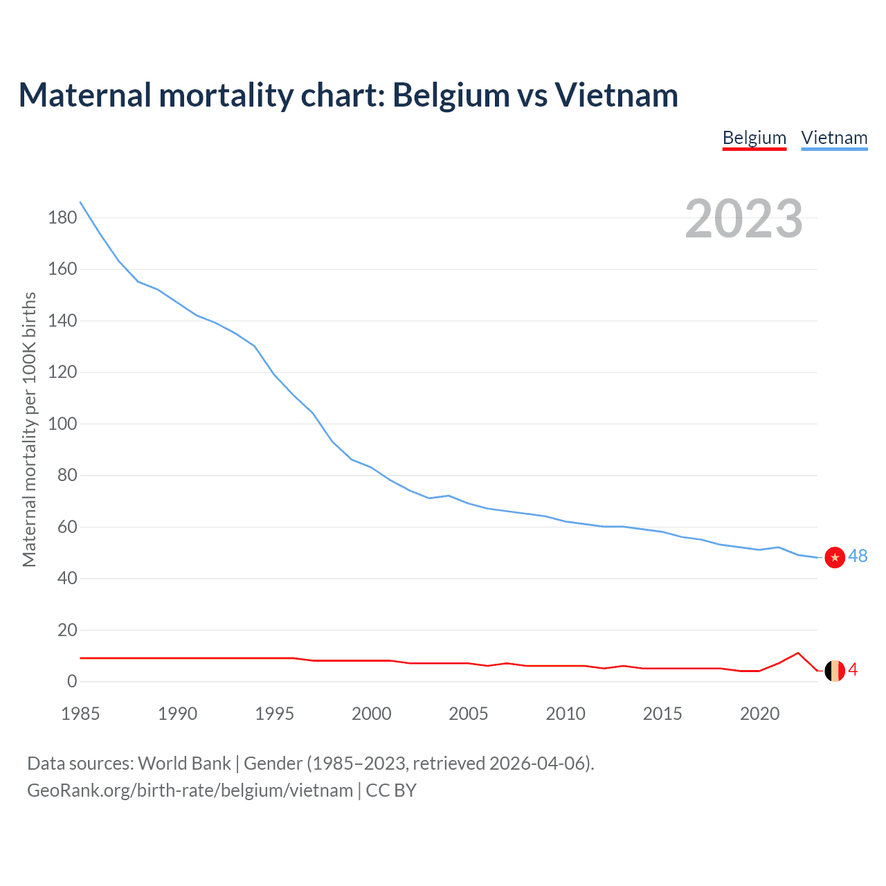 The maternal mortality rate, which is the probability of dying during childbirth or within 42 days of pregnancy termination, is 4 deaths per 100,000 live births in Belgium, compared to 48 deaths in Vietnam.