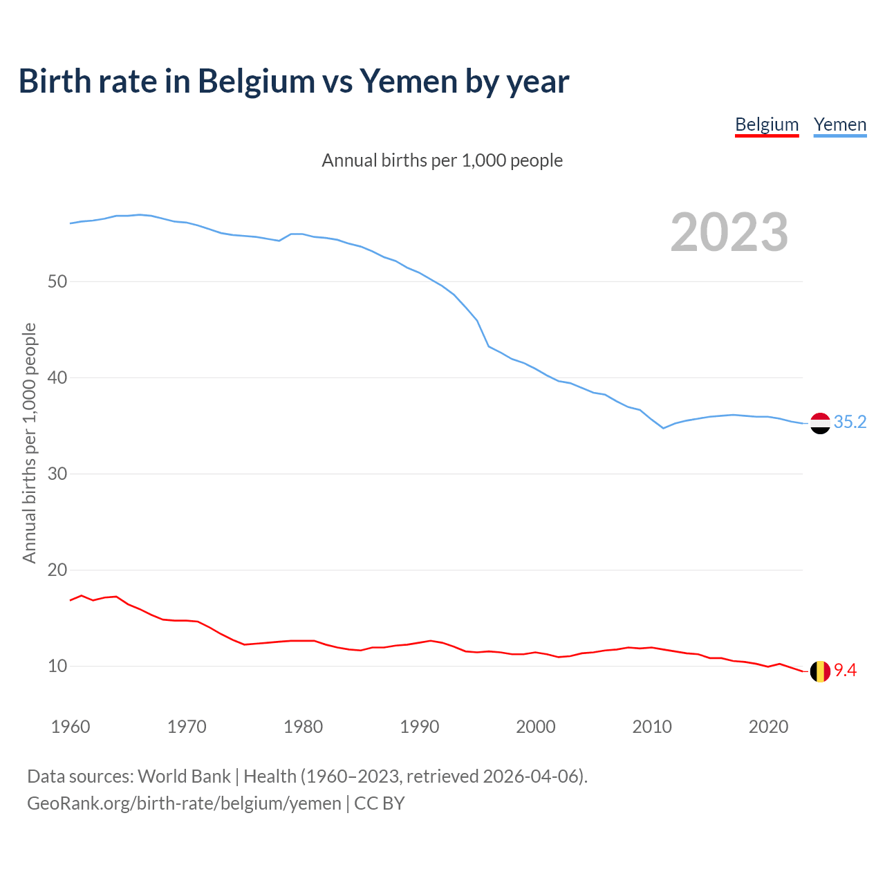 Belgium has an annual birth rate of 9.4 births per 1,000 people, compared to 35.2 for Yemen. The average number of children a woman is expected to have during her lifetime — the fertility rate, is 1.47 in Belgium and 4.59 in Yemen — 212.2% difference.