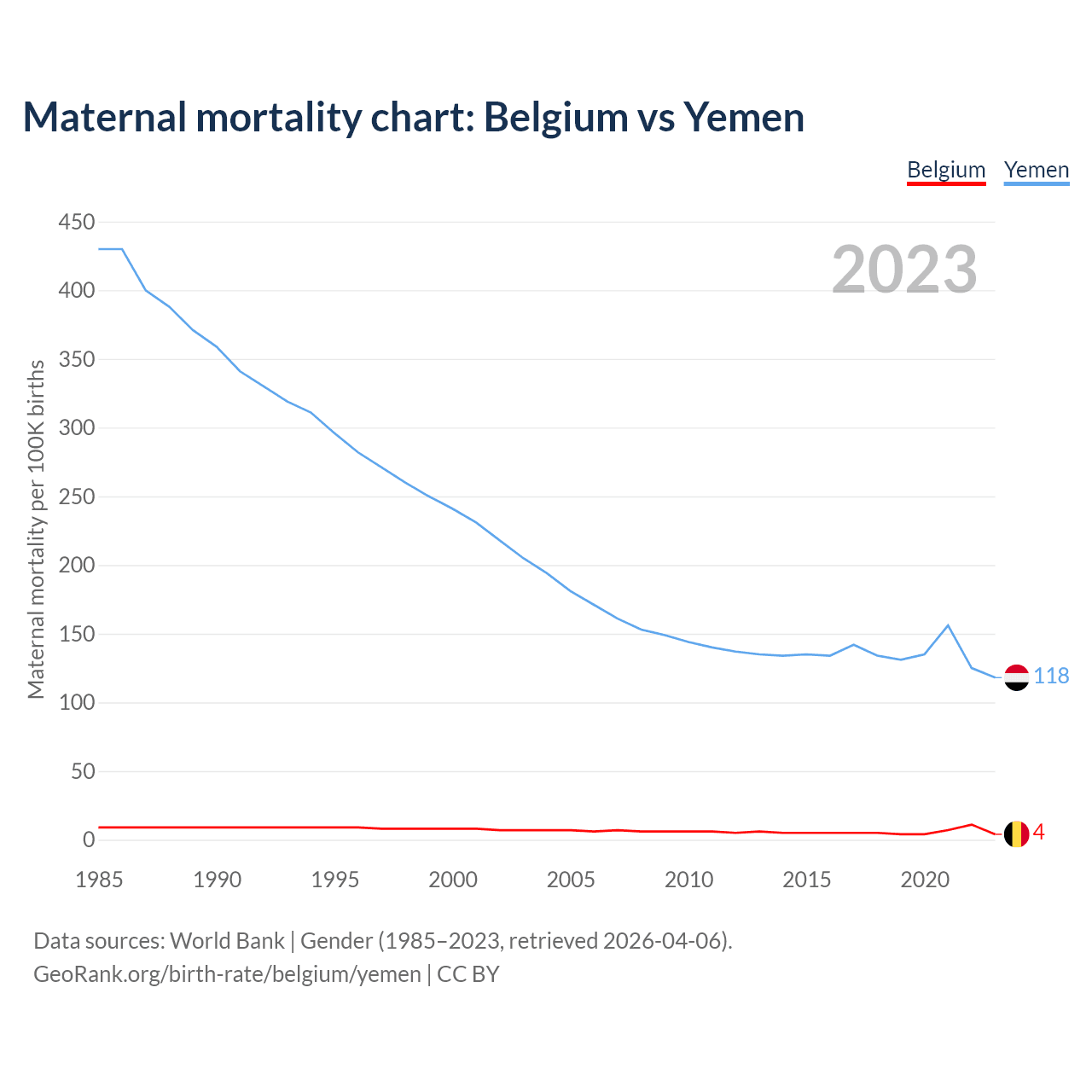 The maternal mortality rate, which is the probability of dying during childbirth or within 42 days of pregnancy termination, is 4 deaths per 100,000 live births in Belgium, compared to 118 deaths in Yemen.