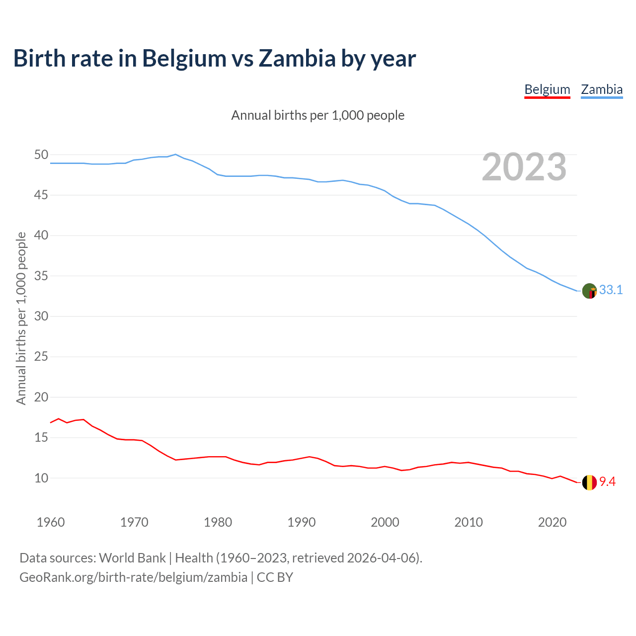 Belgium has an annual birth rate of 9.4 births per 1,000 people, compared to 33.1 for Zambia. The average number of children a woman is expected to have during her lifetime — the fertility rate, is 1.47 in Belgium and 4.1 in Zambia — 179% difference.