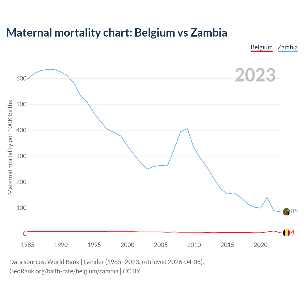The maternal mortality rate, which is the probability of dying during childbirth or within 42 days of pregnancy termination, is 4 deaths per 100,000 live births in Belgium, compared to 85 deaths in Zambia.
