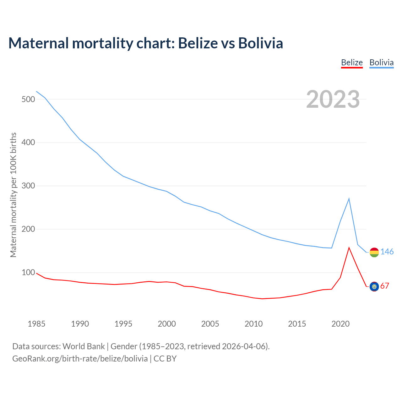 The maternal mortality rate, which is the probability of dying during childbirth or within 42 days of pregnancy termination, is 67 deaths per 100,000 live births in Belize, compared to 146 deaths in Bolivia.