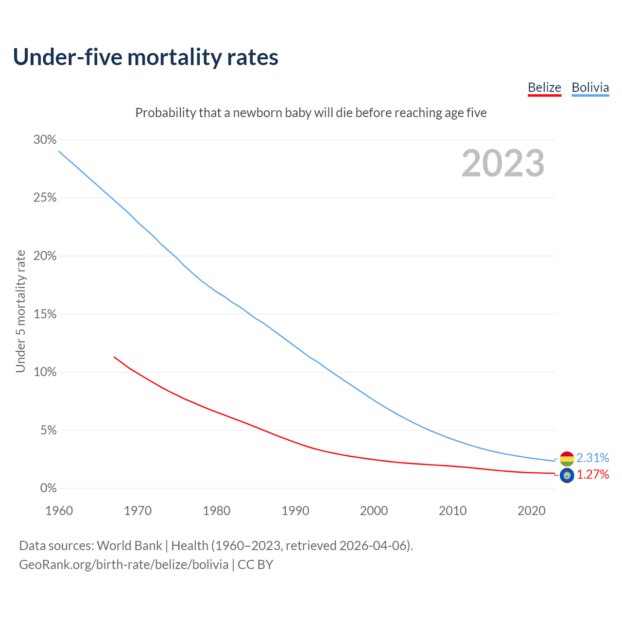 The chance that a newborn baby will die before reaching age five is 1.27% in Belize and 2.31% in Bolivia. Above is a chart with historical data on under-five mortality rates.