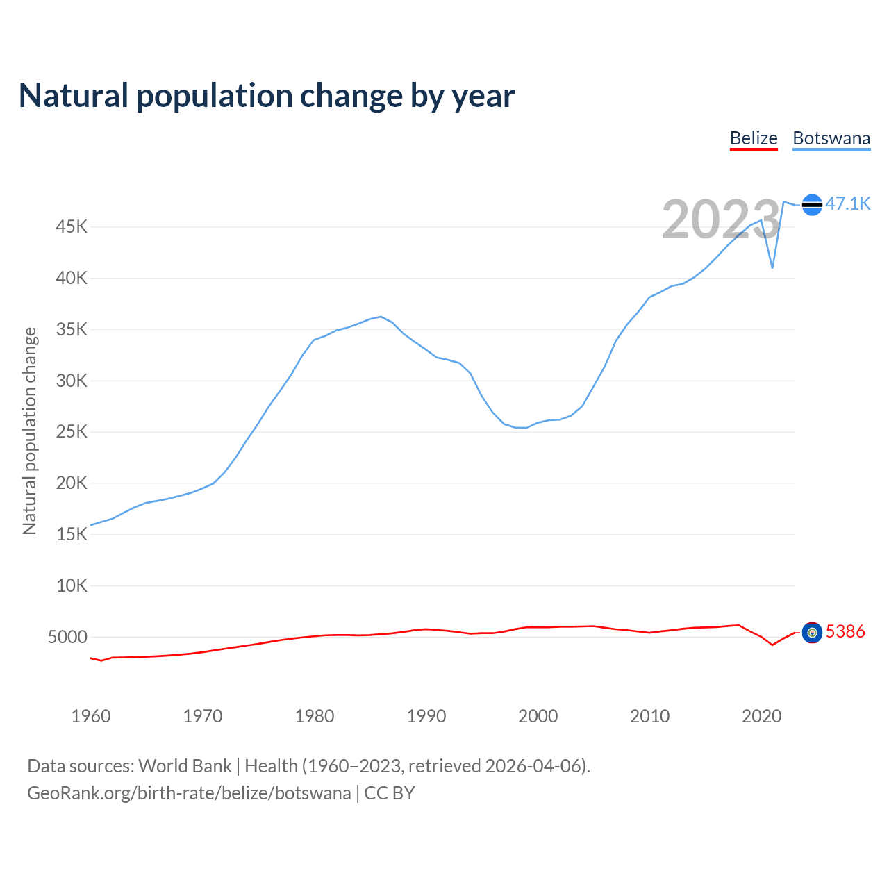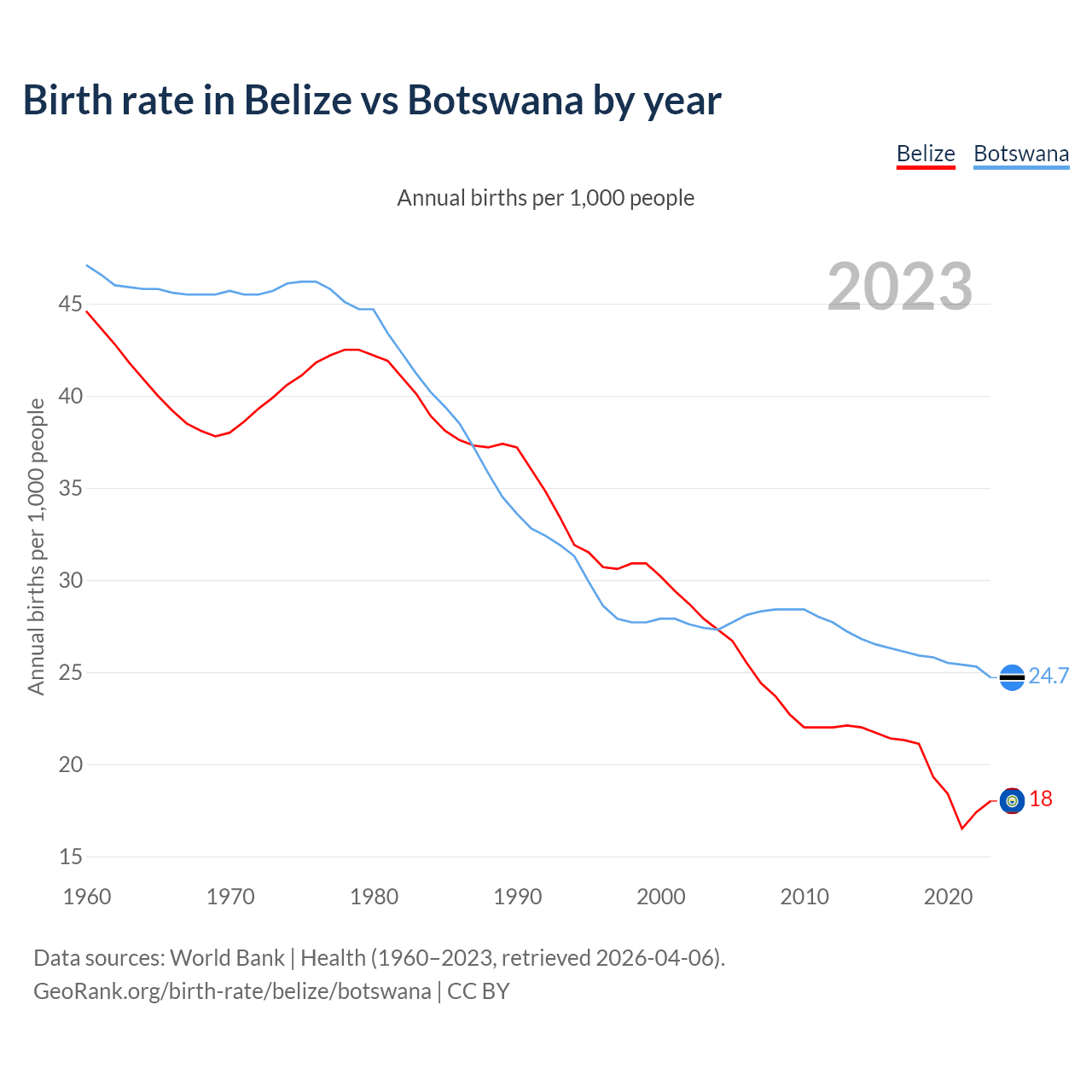 According to the latest available data on birth rates, the fertility rate in Belize was 2.01 children per woman in 2023, compared to 2.73 in Botswana in 2023. The replacement level is considered to be 2.1 children per woman.