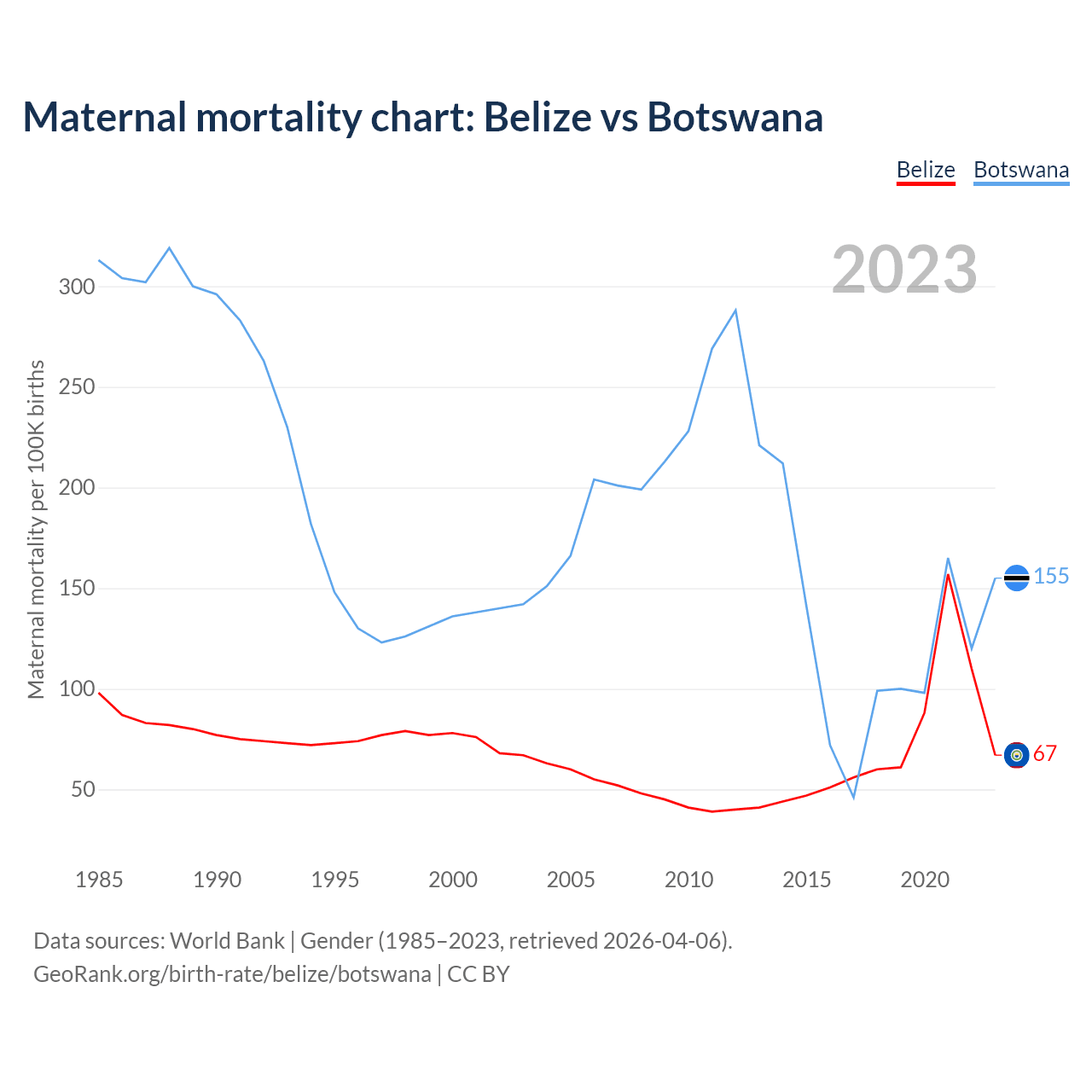 The maternal mortality rate, which is the probability of dying during childbirth or within 42 days of pregnancy termination, is 67 deaths per 100,000 live births in Belize, compared to 155 deaths in Botswana.