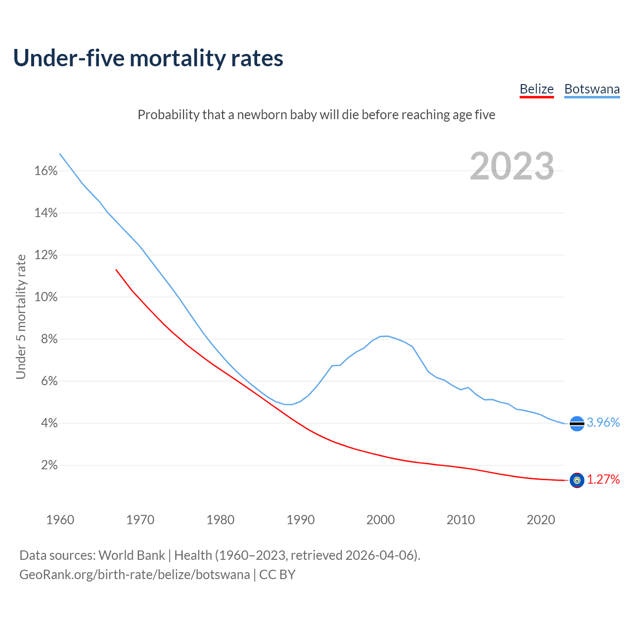 The chance that a newborn baby will die before reaching age five is 1.27% in Belize and 3.96% in Botswana. Above is a chart with historical data on under-five mortality rates.