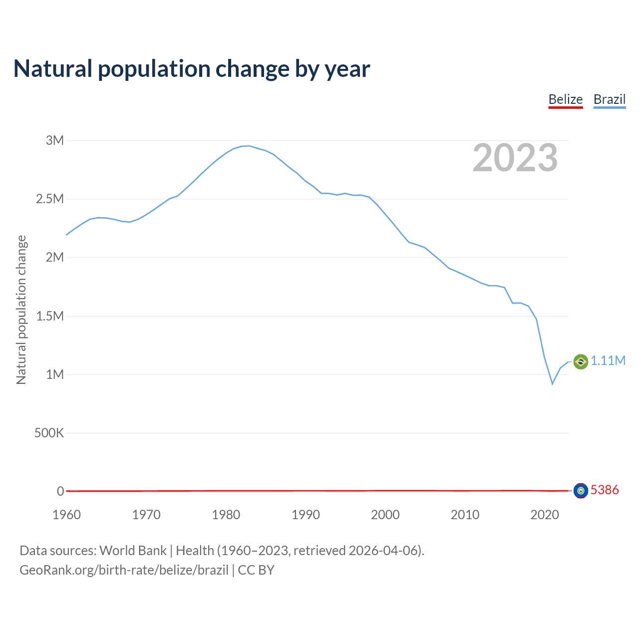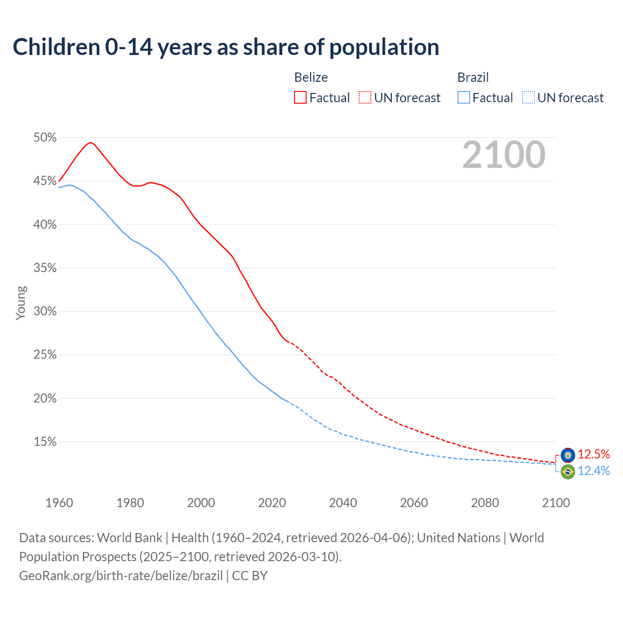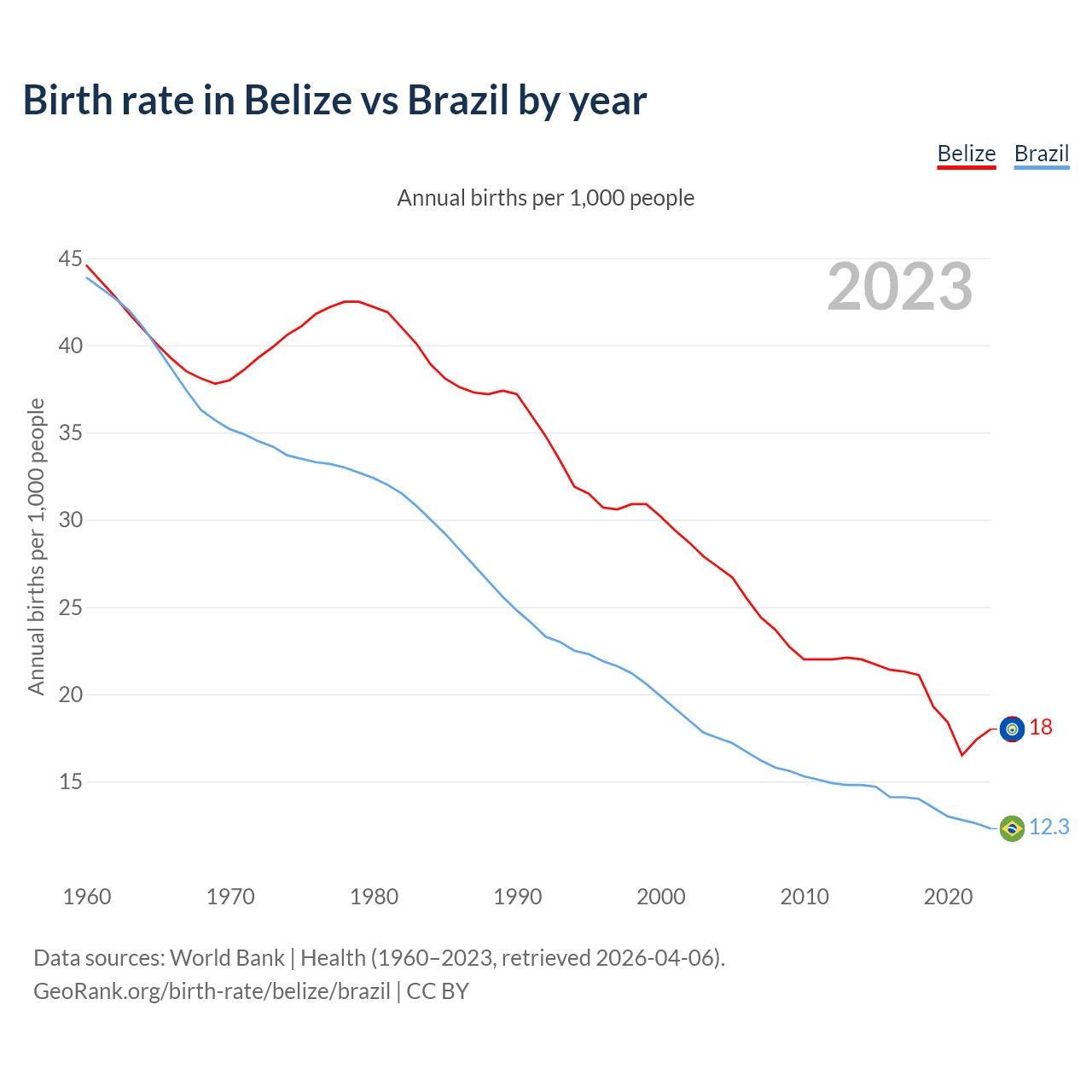 According to the latest available data on birth rates, the fertility rate in Belize was 2.01 children per woman in 2023, compared to 1.62 in Brazil in 2023. The replacement level is considered to be 2.1 children per woman.