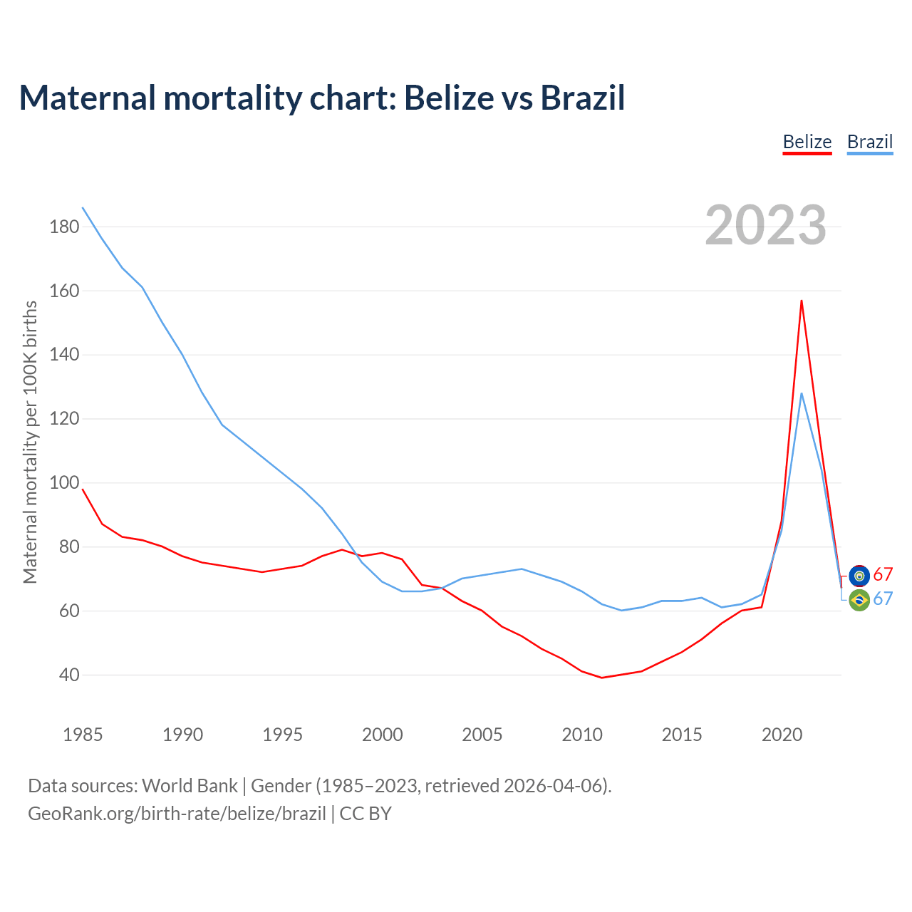 The maternal mortality rate, which is the probability of dying during childbirth or within 42 days of pregnancy termination, is 67 deaths per 100,000 live births in Belize, compared to 67 deaths in Brazil.