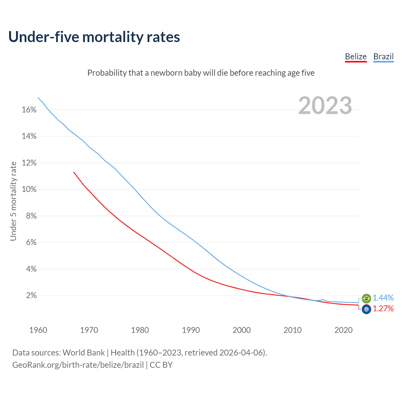 The chance that a newborn baby will die before reaching age five is 1.27% in Belize and 1.44% in Brazil. Above is a chart with historical data on under-five mortality rates.