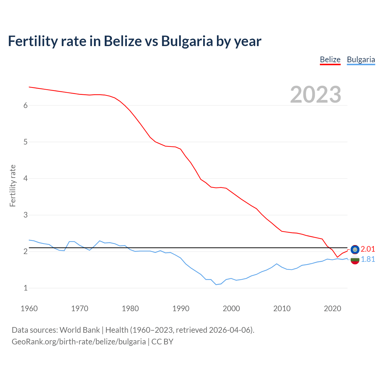 1960 vs 2023, the fertility rate has decreased by 69.1% in Belize and by 21.6% in Bulgaria — in 1960, it was 6.5 and 2.31, respectively.