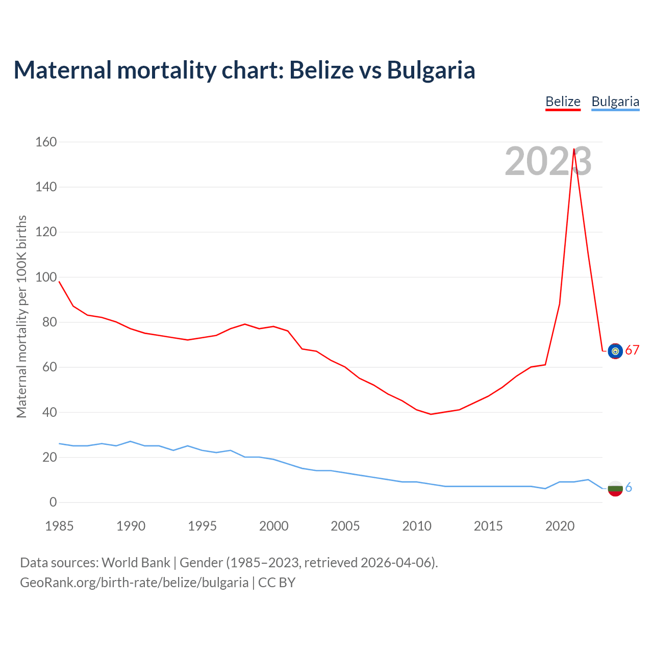 The maternal mortality rate, which is the probability of dying during childbirth or within 42 days of pregnancy termination, is 67 deaths per 100,000 live births in Belize, compared to 6 deaths in Bulgaria.